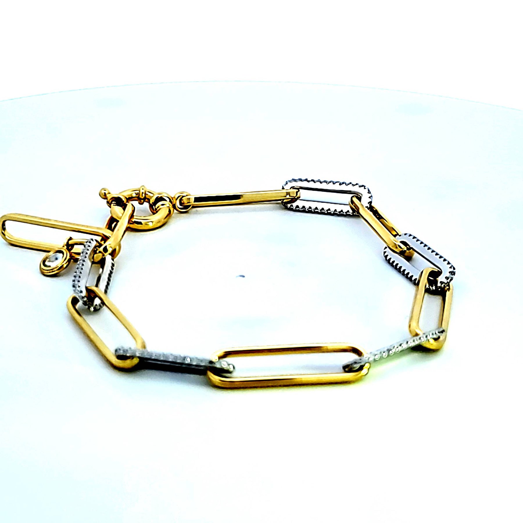 This stunning bracelet combines modern design with timeless elegance. Featuring alternating yellow gold plated and silver links, this piece adds a touch of sophistication to any outfit. Its unique blend of metals makes it versatile enough for both casual and formal occasions. There are 1.65 carat total weight of cubic zirconias set on the white silver links, and the bracelet is 7.5 inches long.