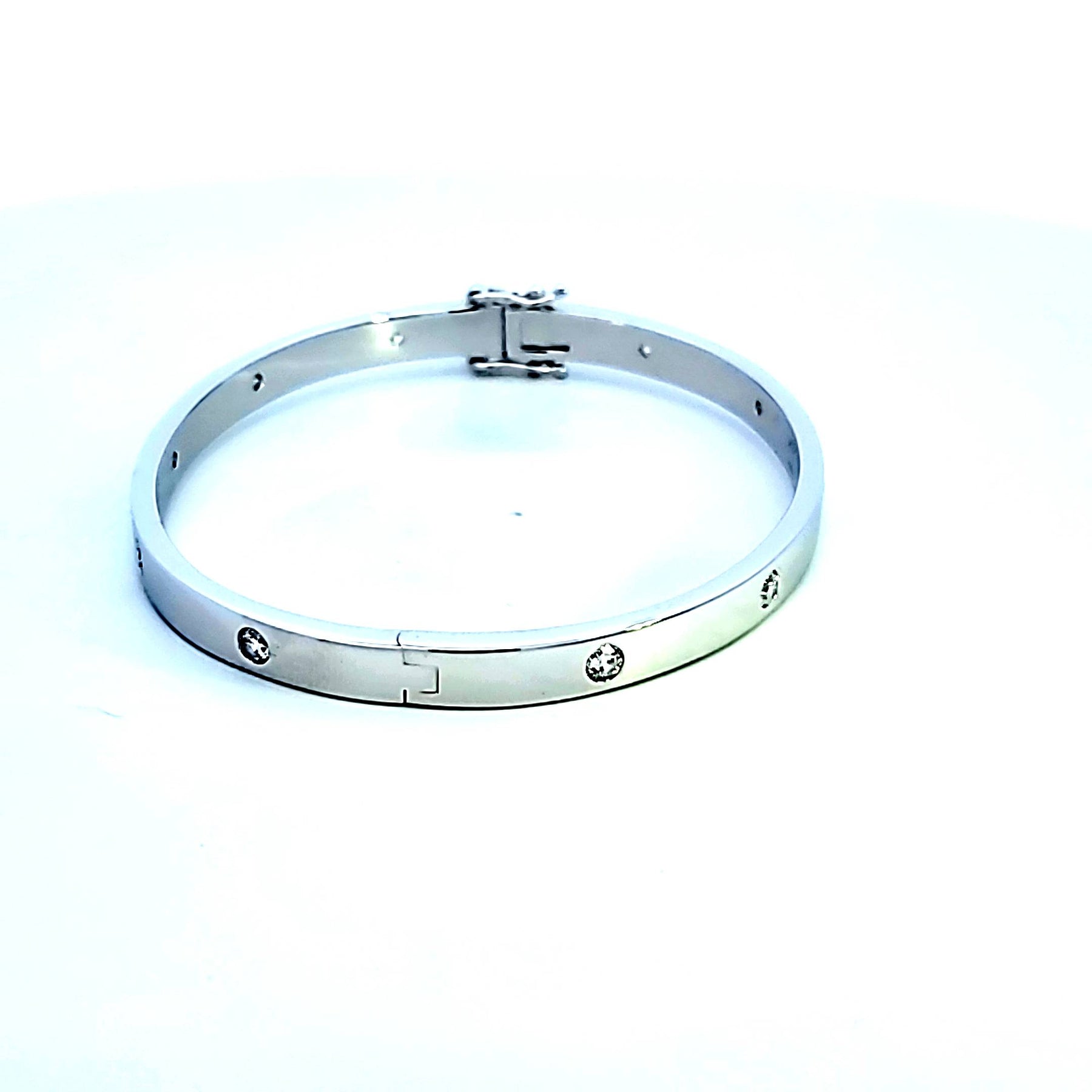 This stunning bracelet is a symphony of elegance and sophistication. Crafted from premium platinum plated sterling silver, it features a sleek design adorned with sparkling .10 carat total weight of cubic zirconias spaced around the bracelet. Perfect for special occasions or as an everyday statement piece.