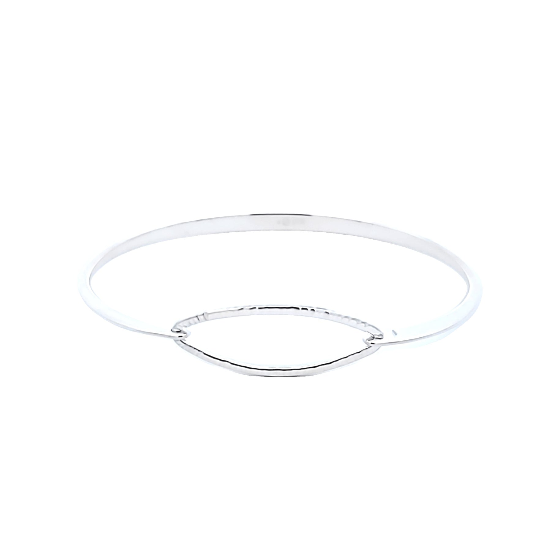 This sterling silver bracelet features a textured oval design at the center of a polished bracelet. It is a beautiful piece of jewelry that you can wear with any outfit. By E. L. Designs.