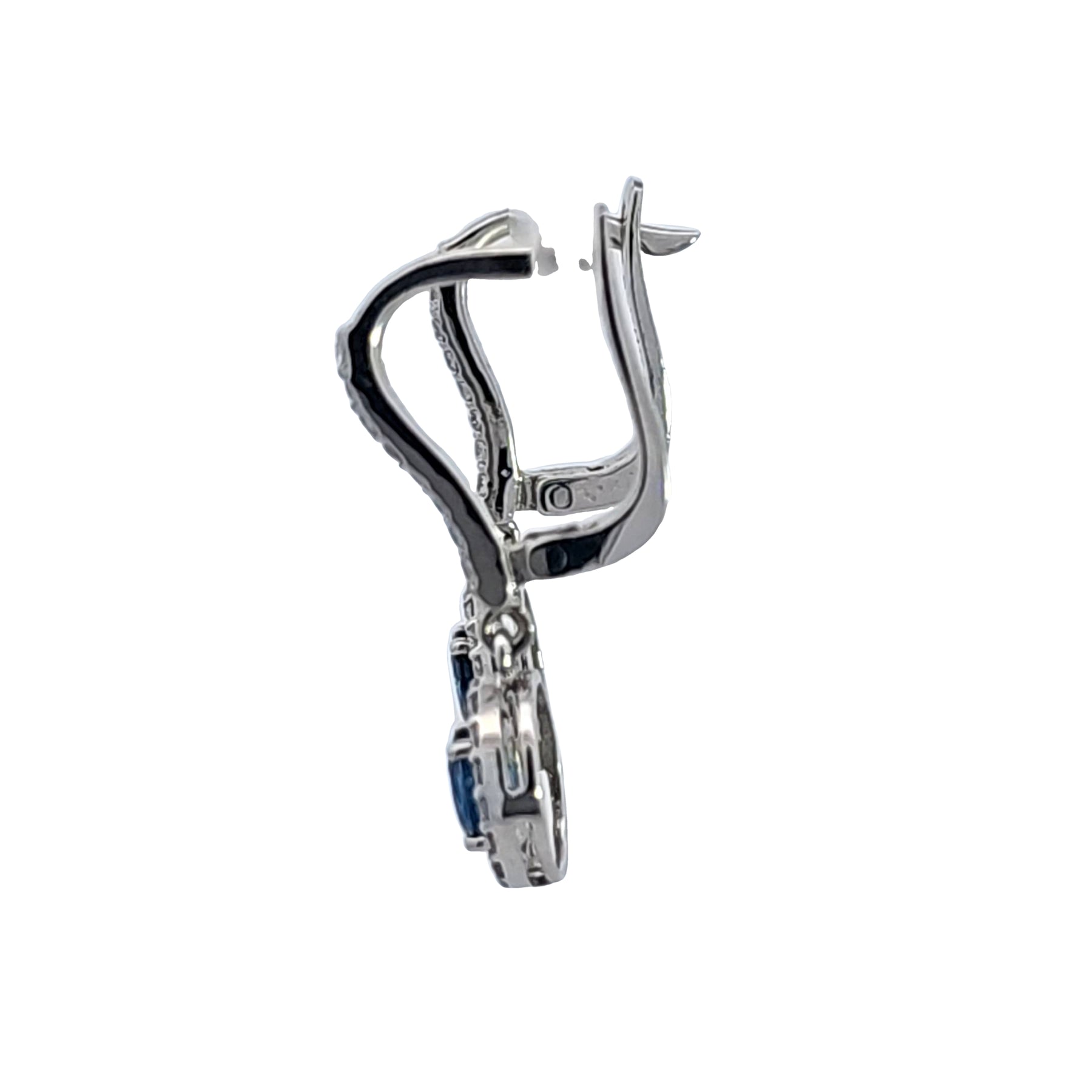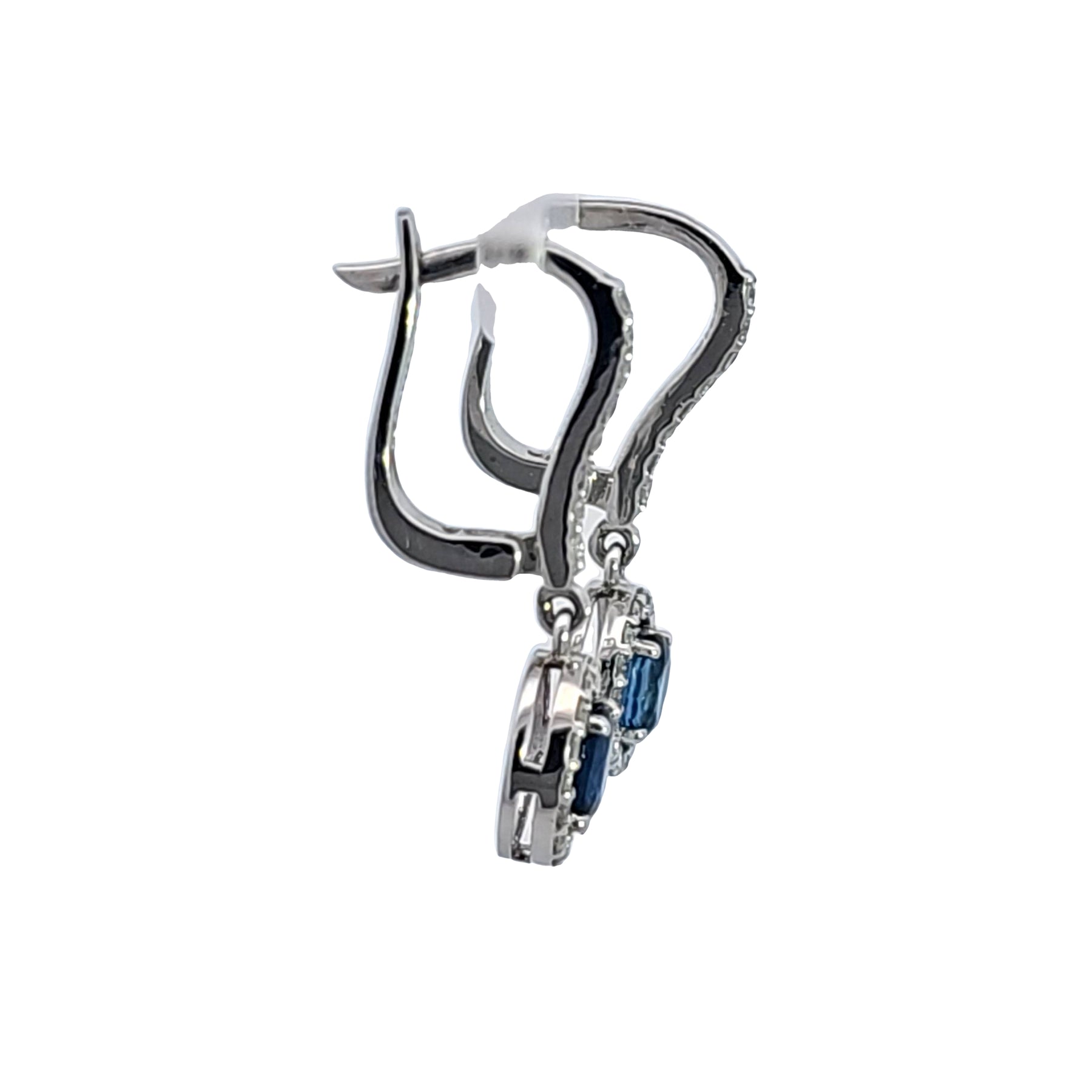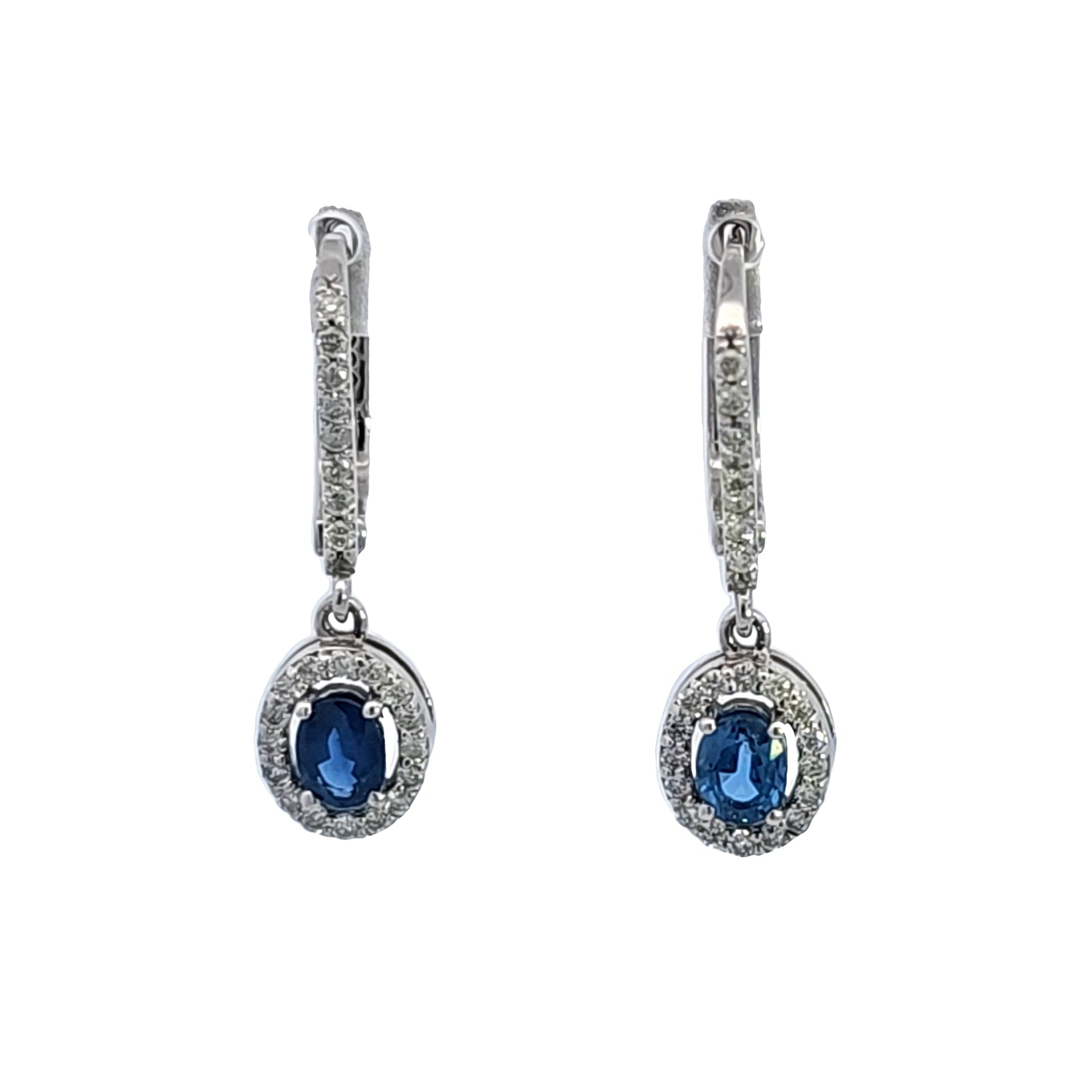 Introducing the epitome of sophistication, these sapphire drop earrings are a true embodiment of elegance and luxury. Encased in shimmering halos of diamonds that accentuate their deep blue hue, they offer a perfect touch of glamour for any special occasion. Crafted in 14K white gold, these earrings feature a total weight of .80 carat of oval Blue Sapphires and .42 carat total weight of diamond.