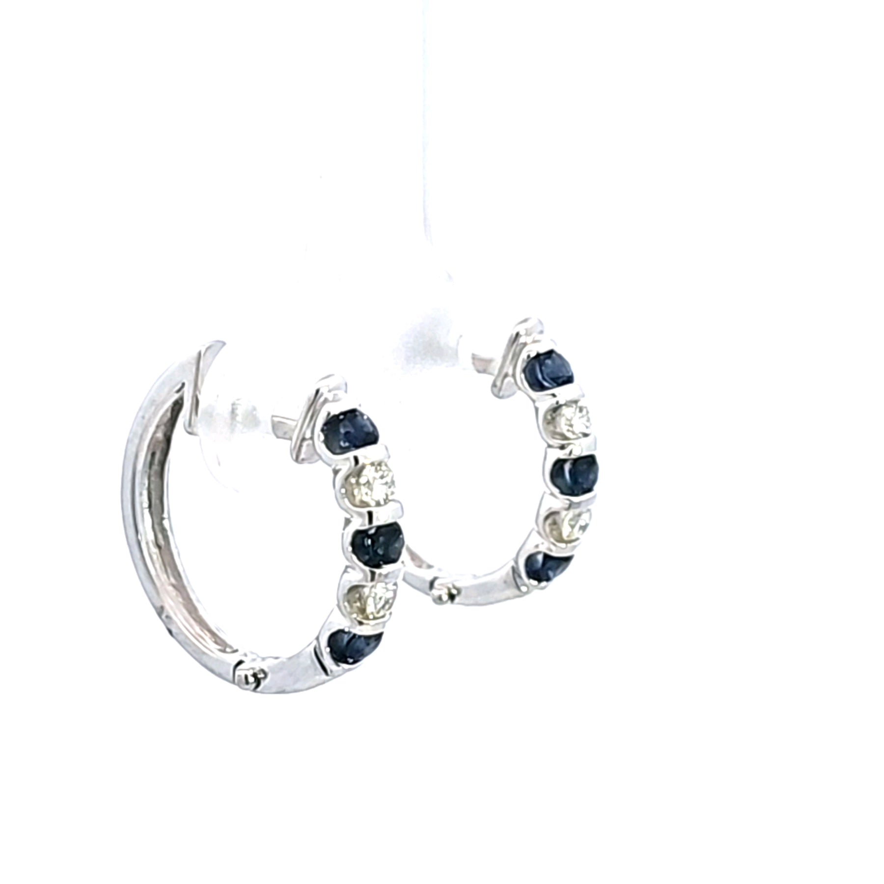 Discover the perfect blend of elegance and sophistication with these stunning blue sapphire and diamond earrings. Crafted with precision, they feature a beautiful arrangement of sparkling stones that catch the light beautifully, making them an ideal accessory for any occasion. The earrings are crafted in 14K white gold, with .40 carat total weight of sapphires and .20 carat total diamond weight.