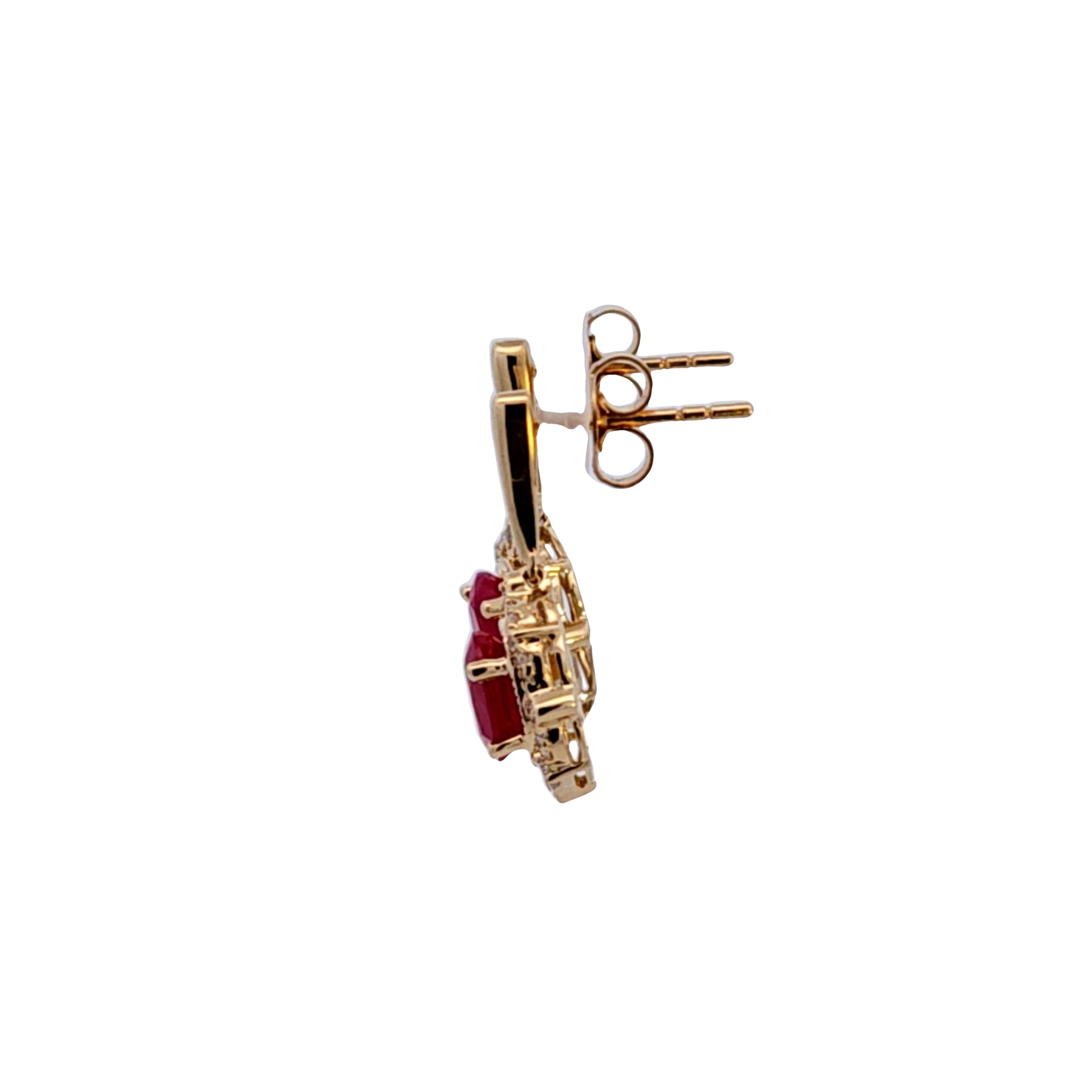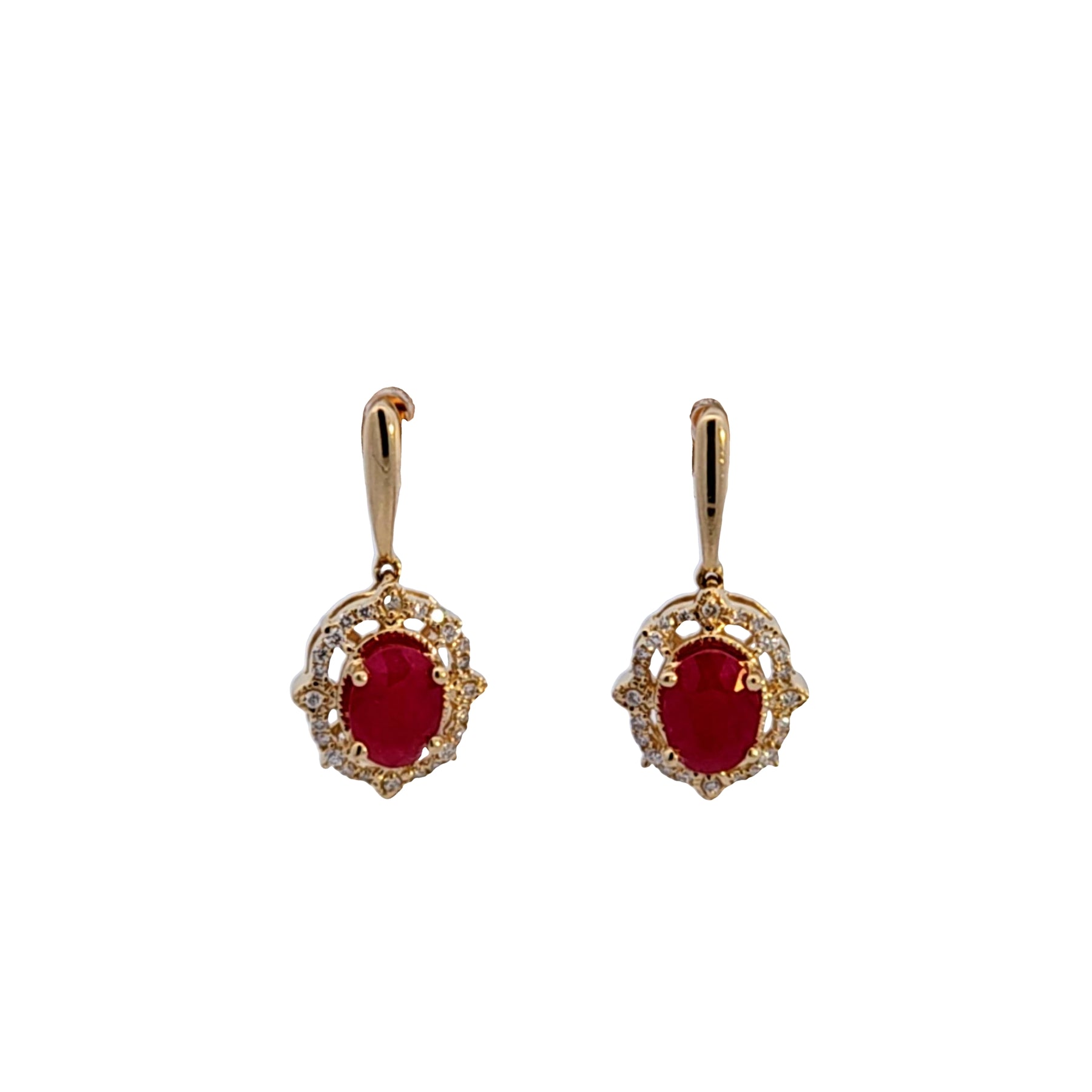 Dazzle with poise in these luxurious ruby drop earrings, featuring a captivating centerpiece of rich round red rubies encircled by halos of twinkling diamonds set in a classic gold frame. The perfect accessory for evening elegance or adding a touch of sophistication to your everyday wear. These earrings feature 1.80 carat total weight of Rubies, and .16 carat total diamond weight.