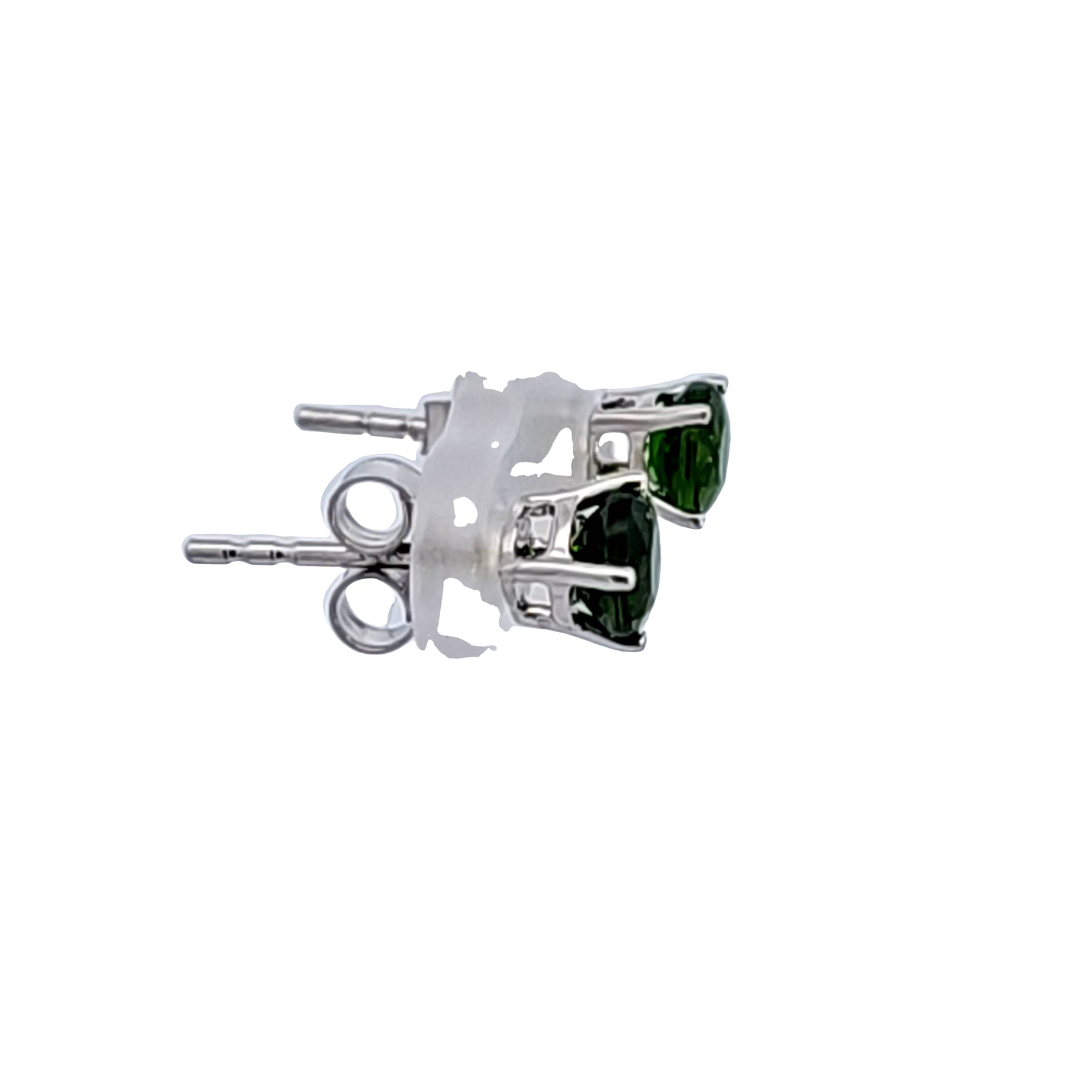 These deep green gemstone earrings will be your new favorite earrings. The earrings feature 1.10 carat total weight of Russalite Chrome Diopsides set in four prong settings of 14K white gold. These earrings are versatile enough to go from daytime to dressy occasions.