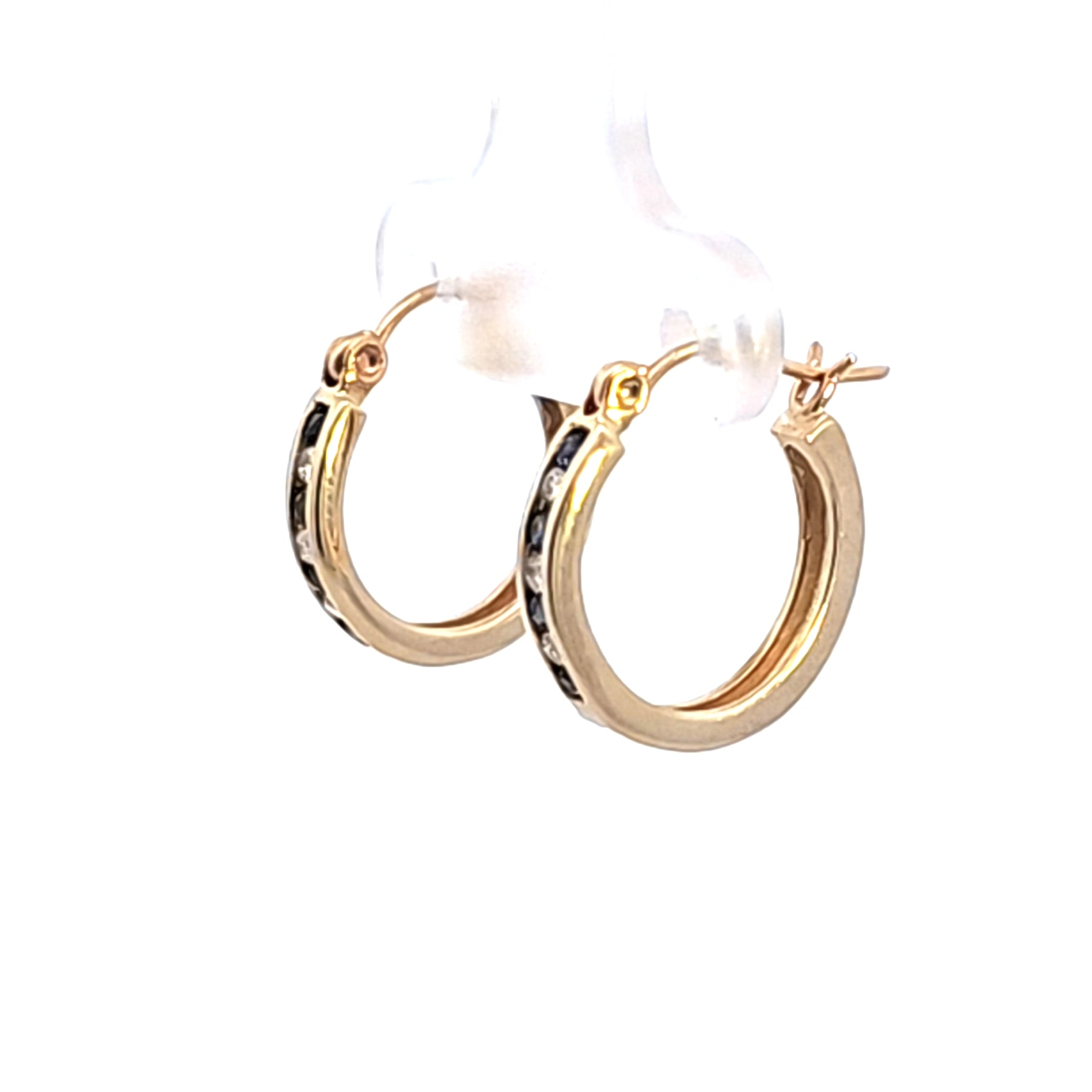 Elevate your style with these exquisite hoop earrings, crafted in radiant 14K yellow gold. Each earring showcases a meticulously arranged row of deep blue round sapphires alternating with diamonds. A timeless design offering a touch of sophisticated glamour for any occasion. The earrings feature .16 carat total weight of sapphires and .09 carat diamond total weight.