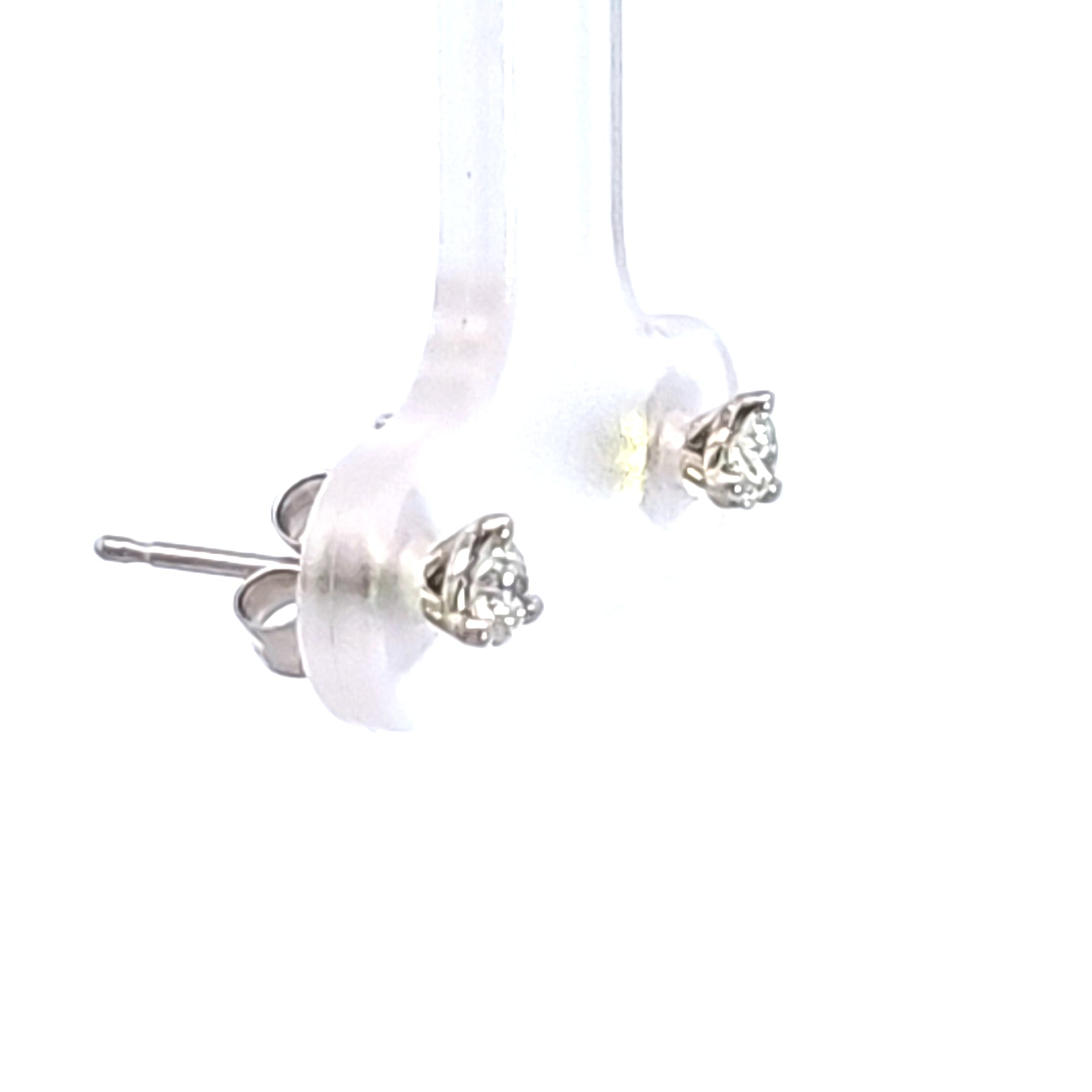 Crafted with precision, these radiant diamond stud earrings are a timeless addition to any jewelry collection. Set in classic gold prongs that enhance their sparkle, they are the epitome of elegance and simplicity. These 14K white gold earrings have a total weight of 1/5 carat diamonds of I1 clarity and G to H in color, in three prong Martini settings.