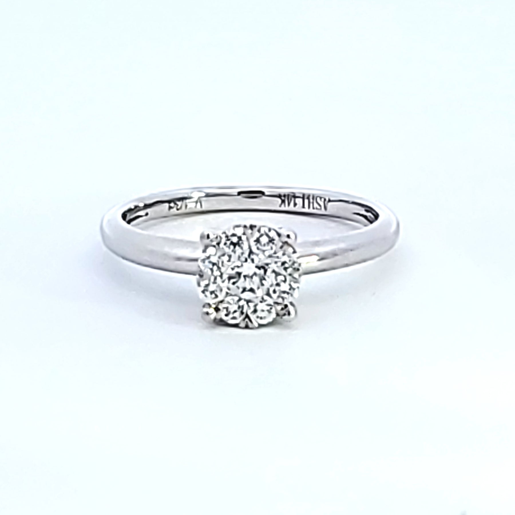 The "Lovebright" collection of diamond rings is designed by Ashi. This "Lovebright" engagement ring has nine full cut diamonds set in a round cluster. The ring has a total of .35ct of diamonds. The band is made of 14K white gold.