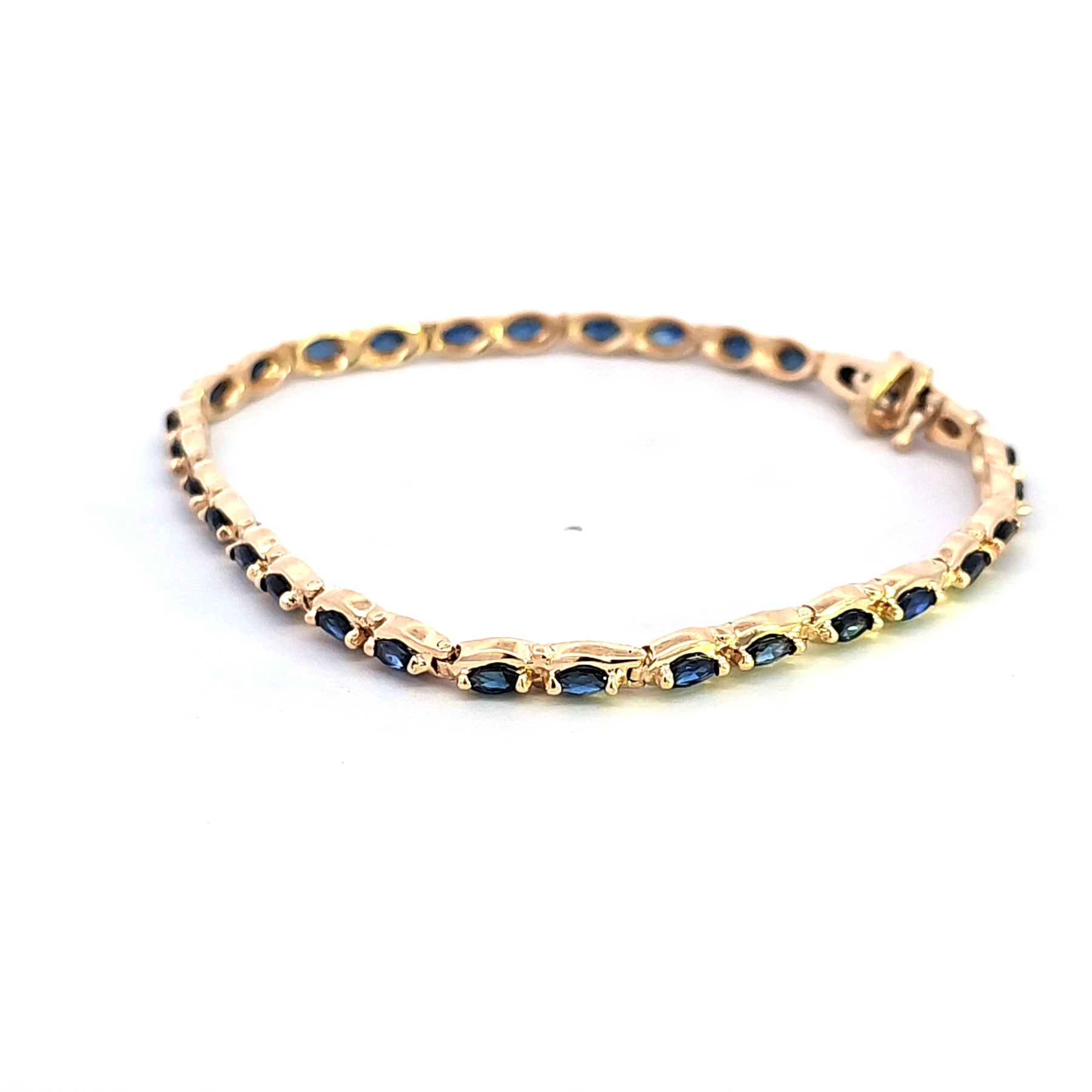 Elevate your style with this classic 14K yellow gold tennis bracelet, featuring a series of thirty-one oval shaped sapphires. These deep blue sapphires are meticulously set to showcase their brilliance and depth of color. This bracelet combines timeless design with a touch of elegance, making it a perfect accessory for any occasion.