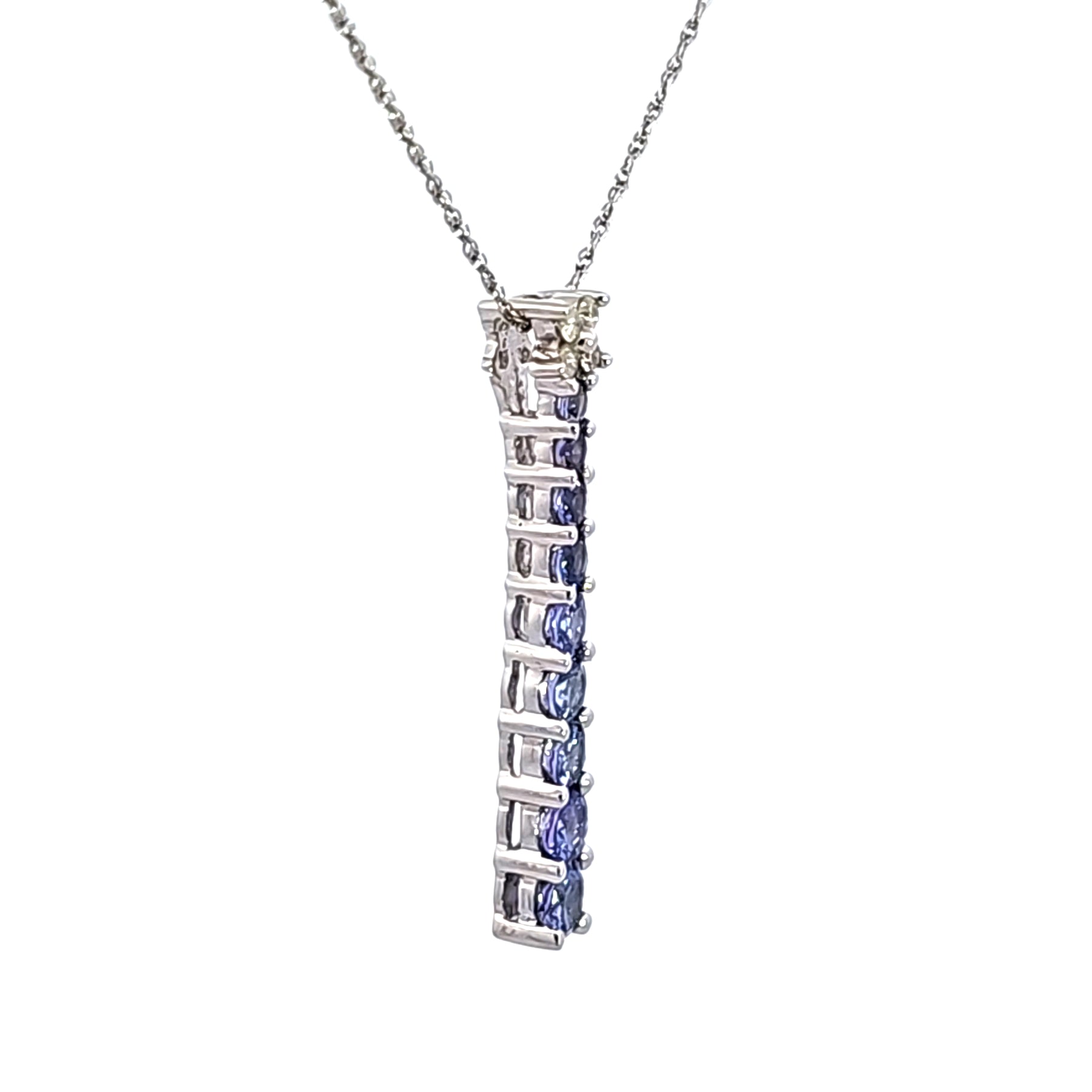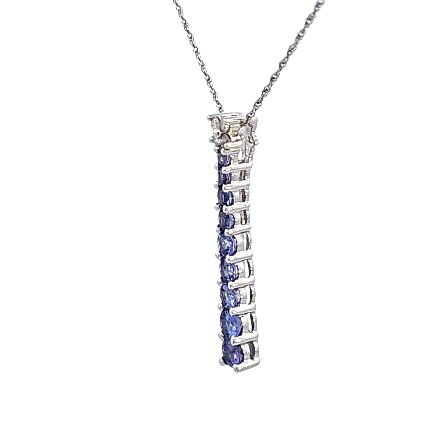 Adorn your neckline with this elegant 14K white gold pendant featuring a cascade of .91 carat total weight of round brilliant cut tanzanite gemstones and .07 carat total weight of accent diamonds. The necklace's captivating bluish purple hue is sure to capture attention, adding a touch of sophistication to any ensemble. A classic piece for everyday elegance. The pendant is suspended from an 18 inch light rope chain.