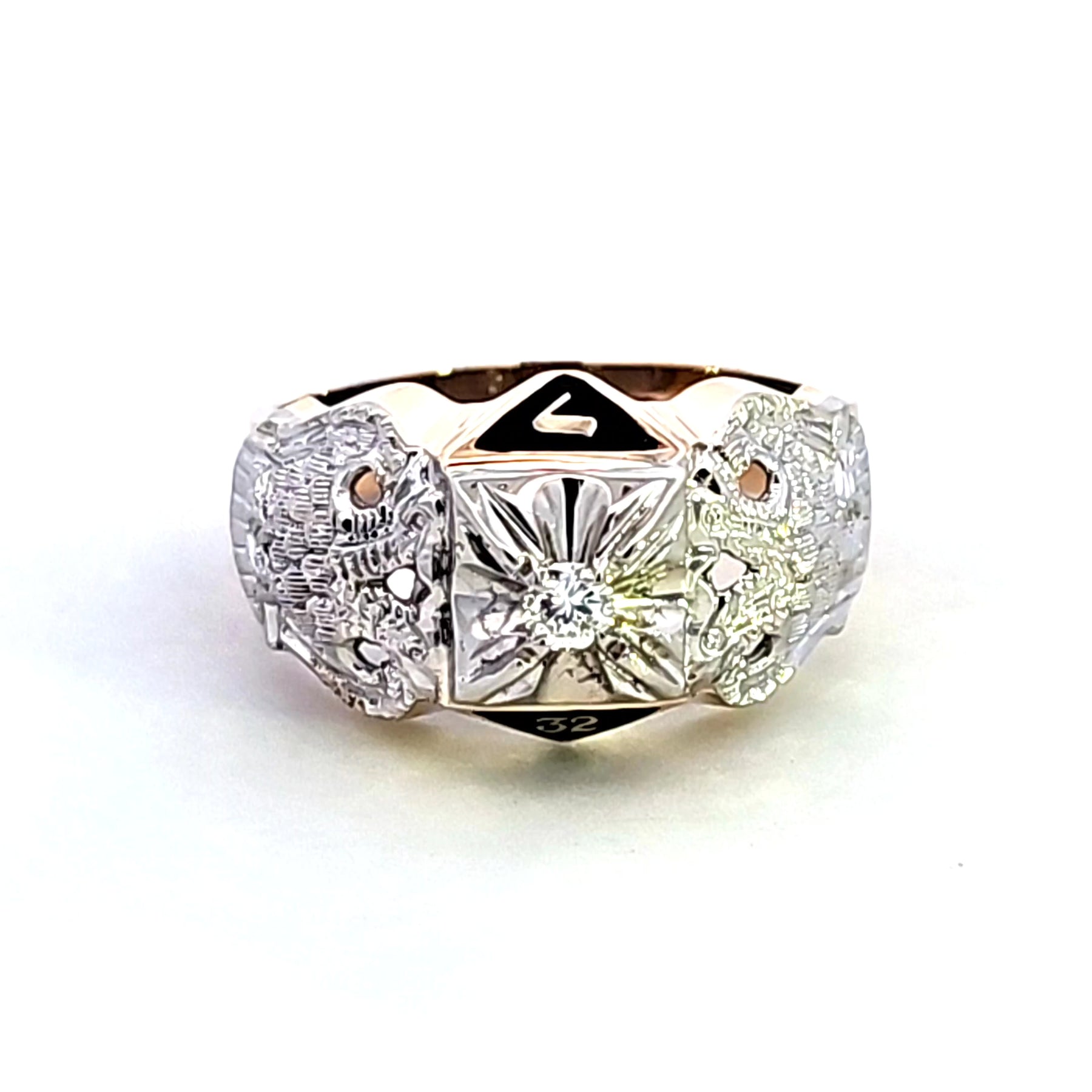 For the Mason in your life, a 32nd degree ring. The ring features intricate drawings and symbols, enhancing its sophisticated appeal. A dazzling .12 carat round cut diamond sits at its heart, cut in a brilliant style ensuring maximum sparkle. Its unique design blends heritage with modern elegance, perfect for adding a touch of class to any ensemble.