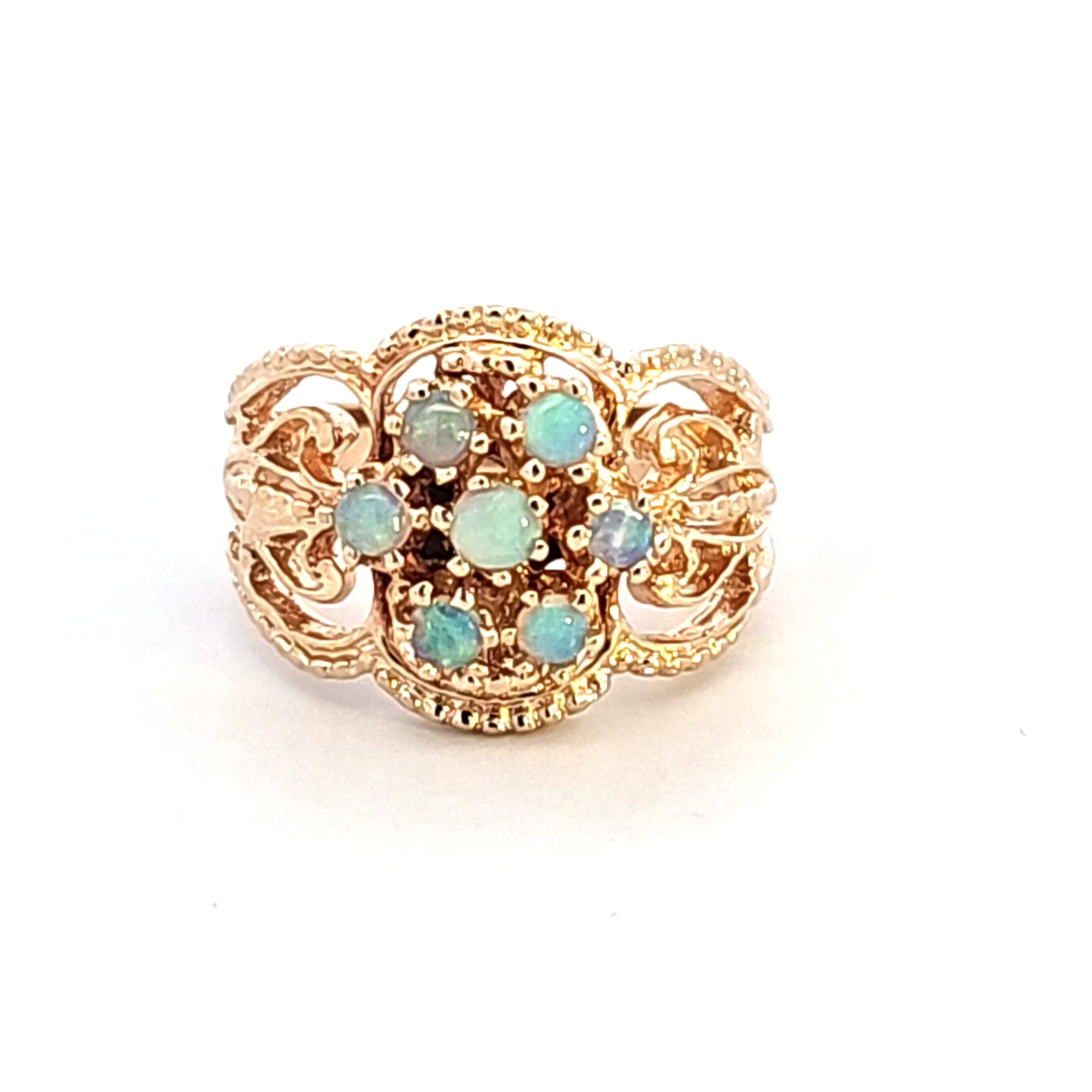 Crafted in warm 14K yellow gold, this captivating Estate Collection ring features a cluster of round cabochon opals. The opals, with their distinctive bluish green play of color, create a mesmerizing effect. This ring combines classic design with the alluring charm of opals, making it a standout addition to any fine jewelry collection.