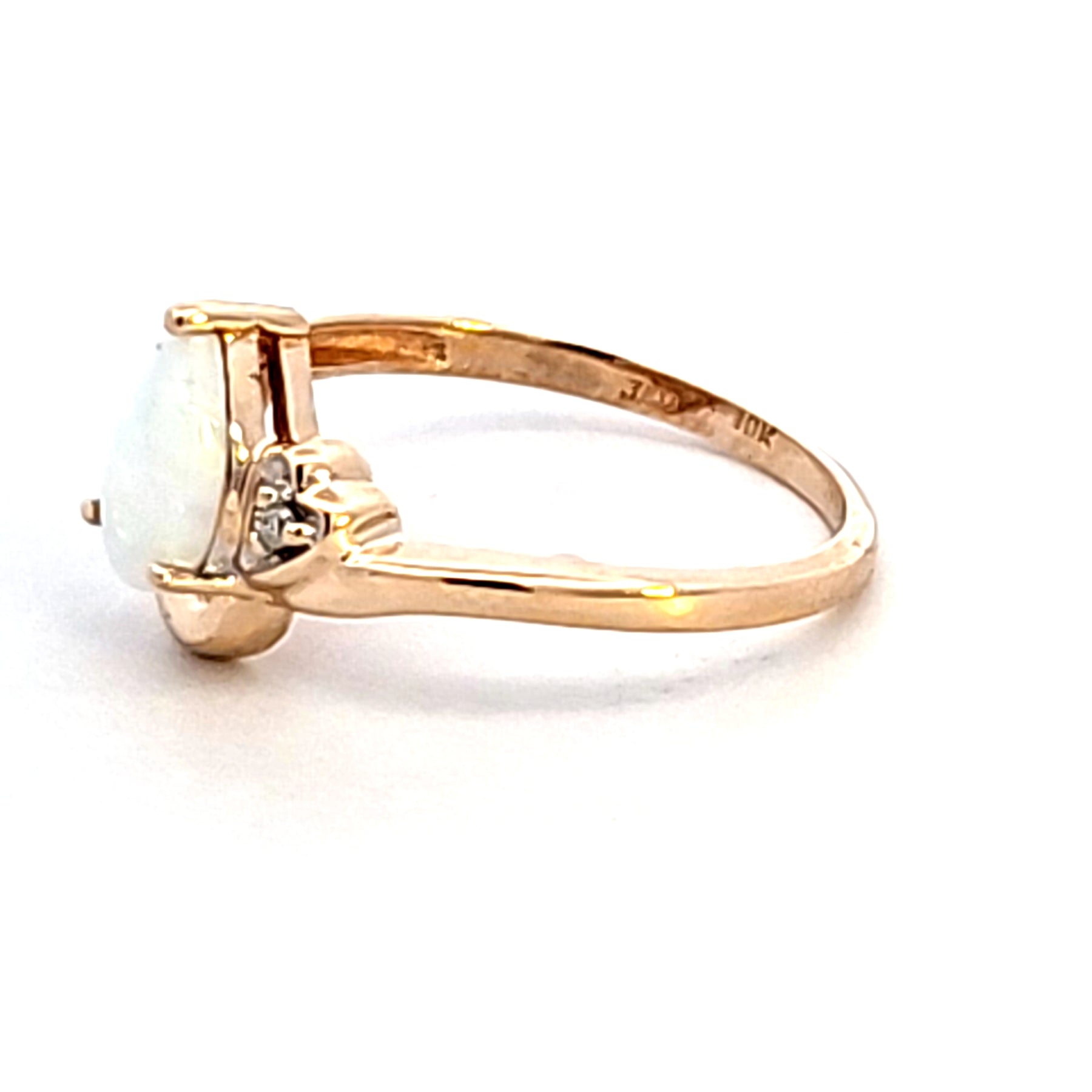Elevate your jewelry collection with this alluring Estate ring. The 10K yellow gold band provides a warm and classic foundation, beautifully offsetting the ethereal opal. This 7 by 5 mm pear-shaped cabochon opal accented by two small diamonds creates a captivating focal point. A testament to refined taste and timeless design, this ring is an exquisite addition to any ensemble.