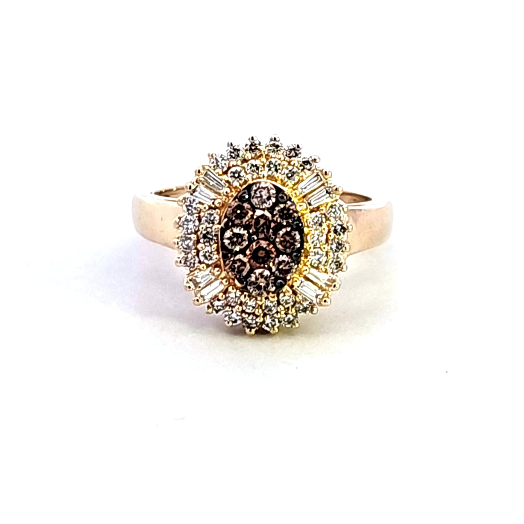 Indulge in the charm of this ring, set in radiant 14K yellow gold. A central cluster of round cut fancy chocolate brown diamonds takes center stage, exhibiting a brilliant cutting style that amplifies their inherent sparkle. This exquisite piece is a testament to refined elegance, ideal for adding a touch of warmth and sophistication to any ensemble. The ring features a total diamond weight of 1.03 carats.