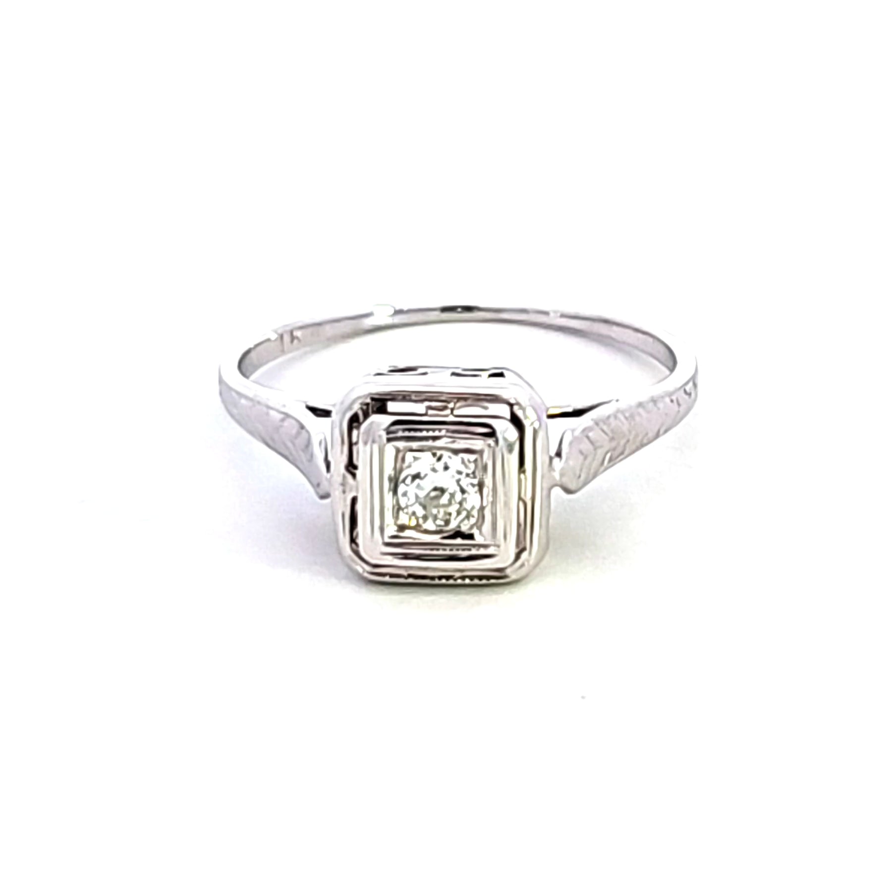 Embrace minimalist elegance with this timeless 14K white gold solitaire ring. Featuring a .10 carat European diamond, this ring offers a classic and refined aesthetic. Perfect for those who appreciate understated luxury, this ring is an enduring symbol of sophistication and style. Elevate your jewelry collection with this essential piece from our Estate Collection.
