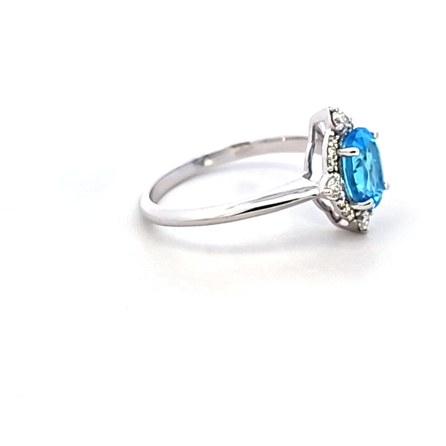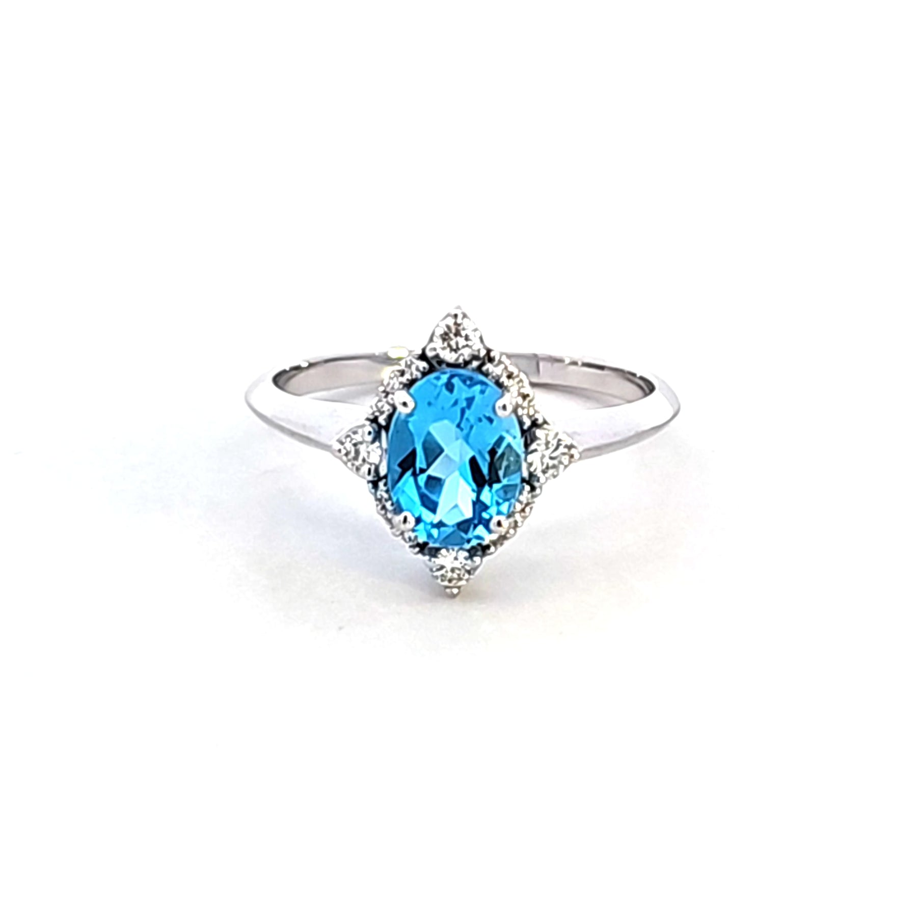 This beautiful Estate Collection ring features a brilliant 8 by 6 oval blue topaz accented by a halo of .20 carat total weight of sparkling diamonds. The classic design is simple yet elegant.