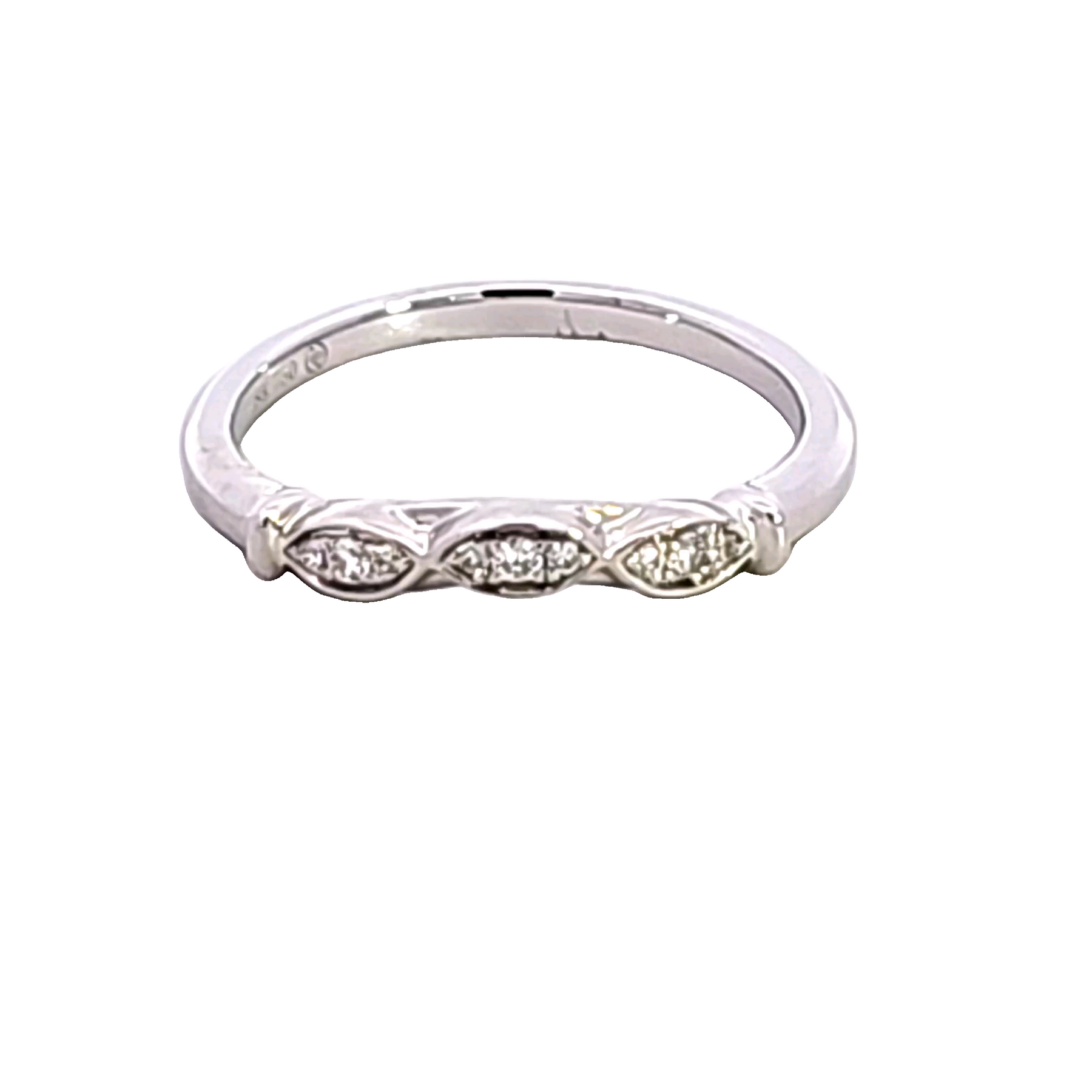 This elegant diamond ring features a sleek, minimalistic design adorned with nine sparkling diamonds encased in three marquise-shaped settings. Crafted from high-quality materials, it's the perfect piece to add a touch of sophistication to any outfit. The ring is crafted in 18K white gold and has a total weight of .07 carat.