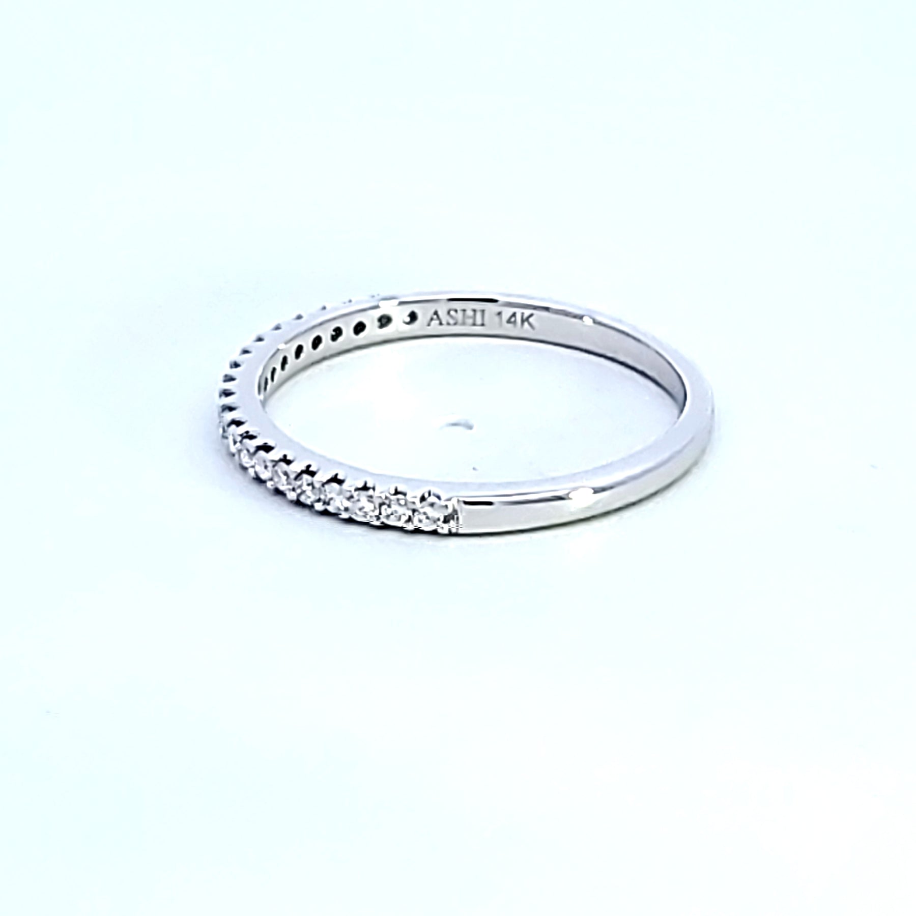 This beautiful diamond wedding band features twenty-one full cut diamonds common prong set across the band. The ring features a total weight of .20 carat and is crafted in 14K white gold.