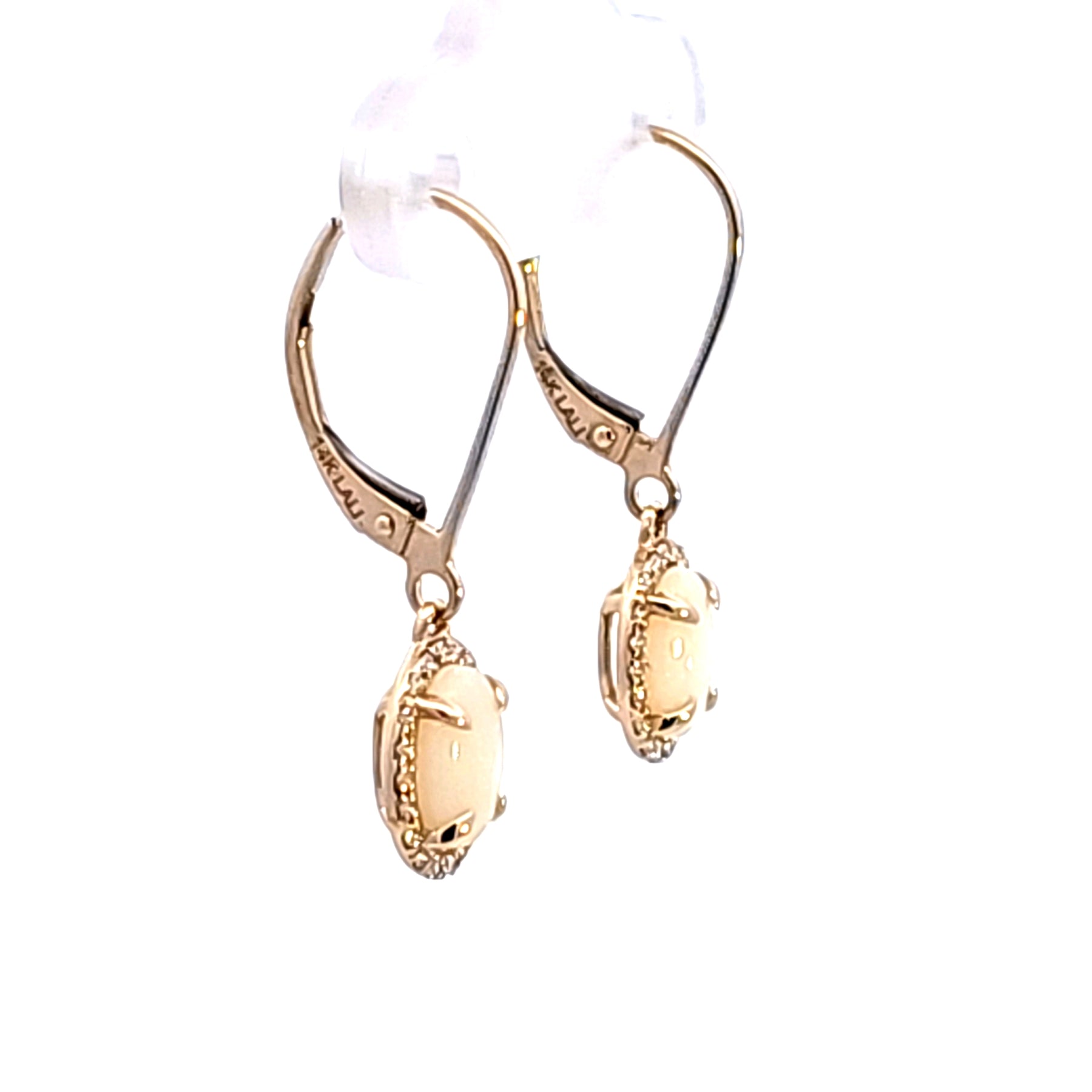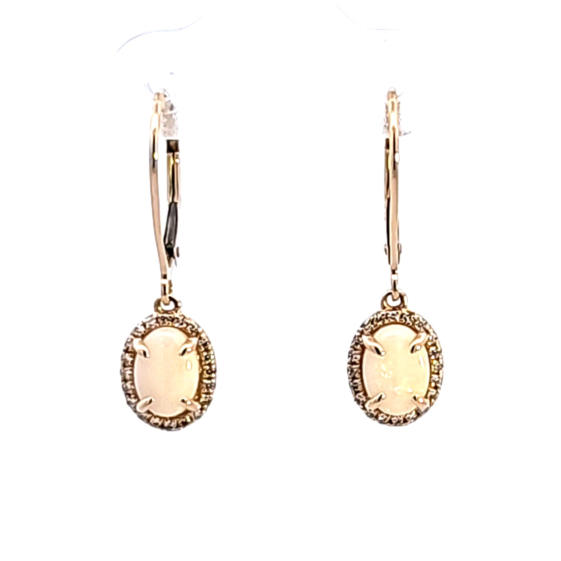 These stunning 14K yellow gold earrings feature a delicate design that adds a touch of elegance to any outfit. The intricate diamond detailing around the 7 by 5 mm oval Australian opal gemstones creates a captivating look, perfect for both casual and formal occasions. Elevate your jewelry collection with this timeless piece that embodies sophistication.