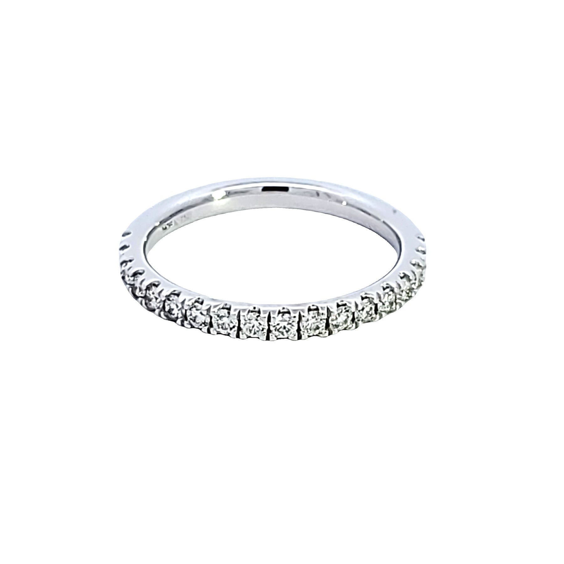 This dazzling diamond band in 18K white gold features 18 Hearts on Fire diamonds of VS2 toSI1 quality and I to J color, prong set across the band. This is a classic and elegant design that is perfect for brides looking for a simple but elegant band.