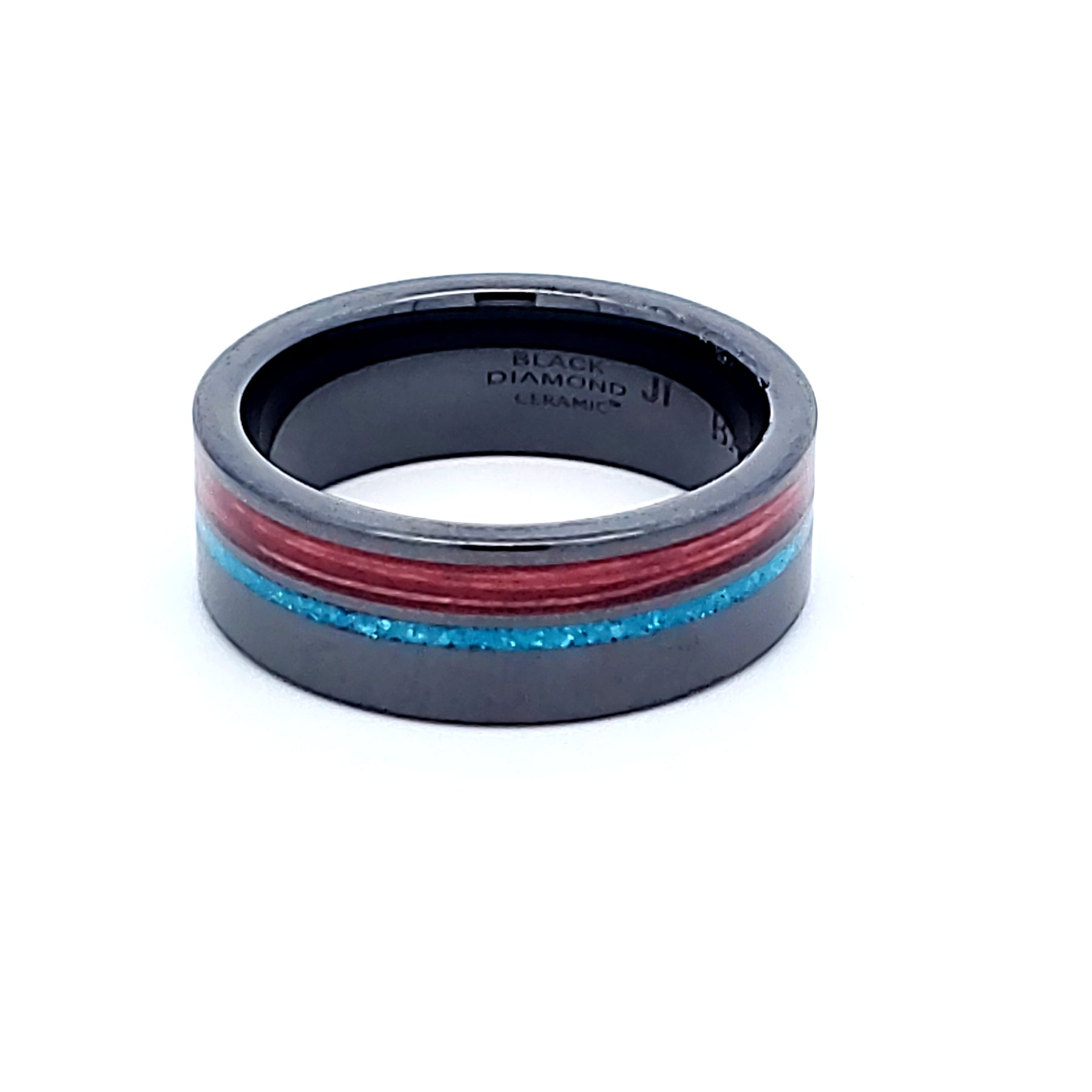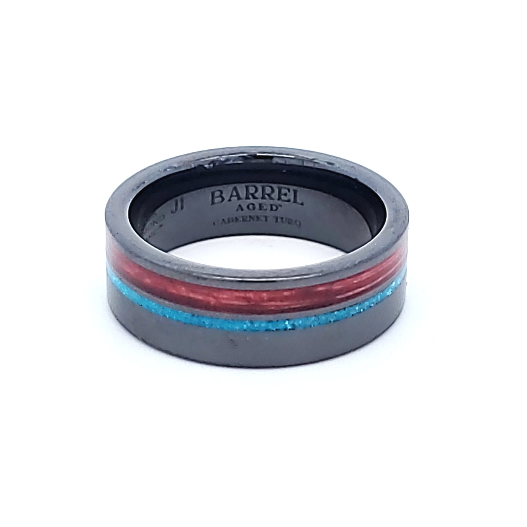 Inspired by the barrel-aging process, this band is handcrafted with black ceramic and features inlays made from turquoise and wood. The barrel-aging process uses time and oak barrels to add flavor to the whiskey. This ring is an elegant interpretation of the barrel-aging process, and is an excellent choice for your wedding band.