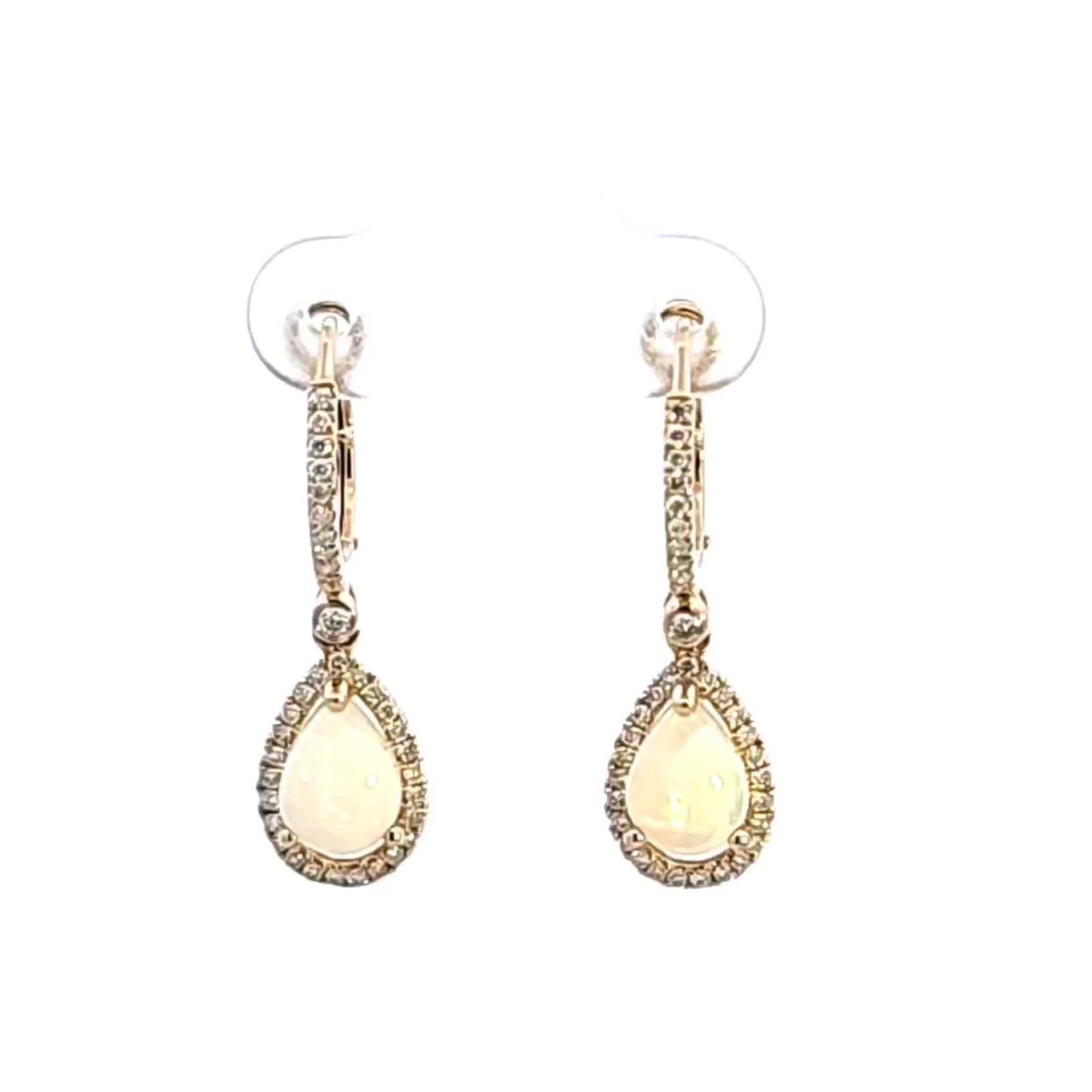 Discover the allure of these elegant teardrop earrings, designed to add a touch of sophistication to any outfit. Crafted with precision, they feature a stunning pear cabochon opal stone surrounded by sparkling accents, making them perfect for both casual and formal occasions. The total weight of the opals is 1.40 carats, with .42 carat total weight of shimmering diamonds.