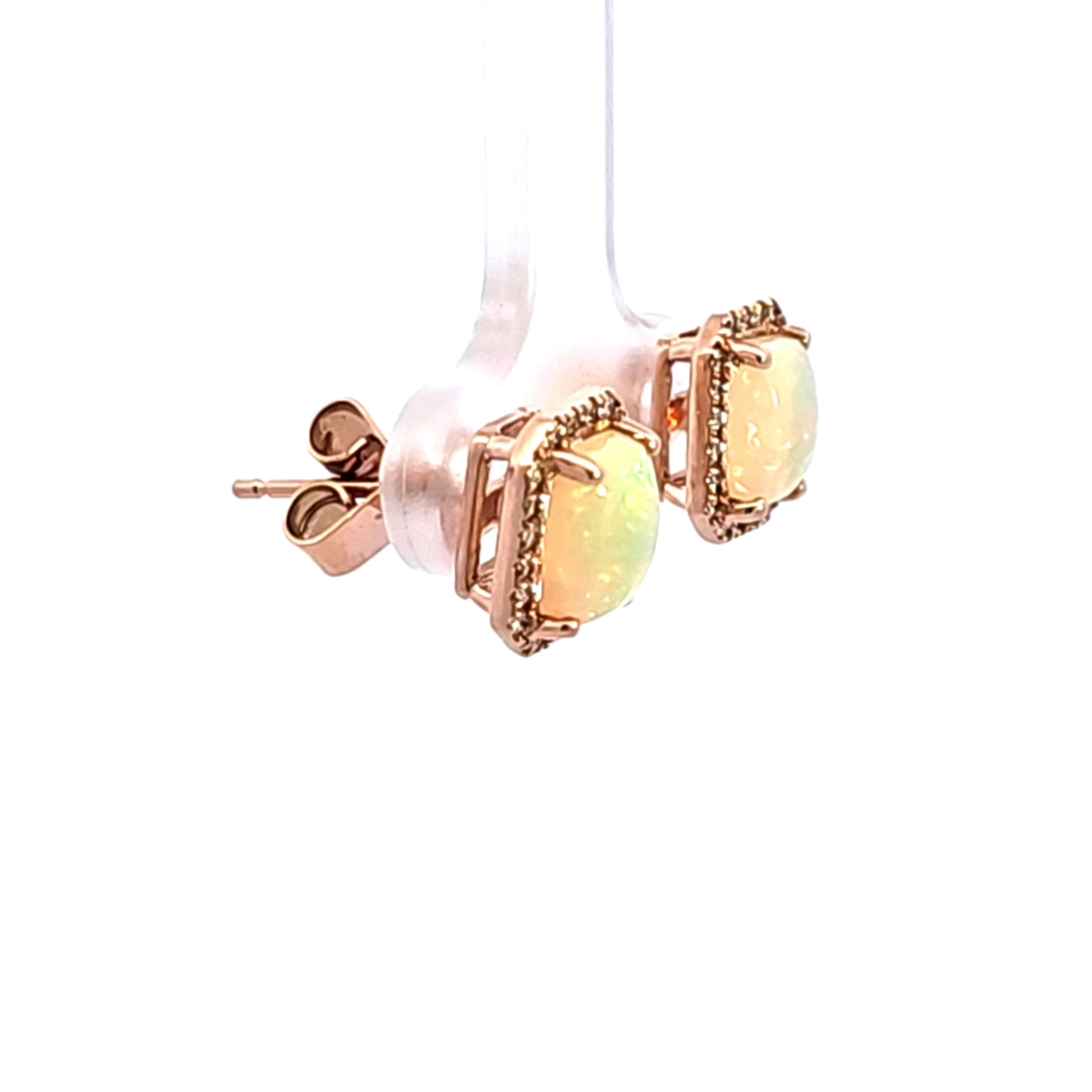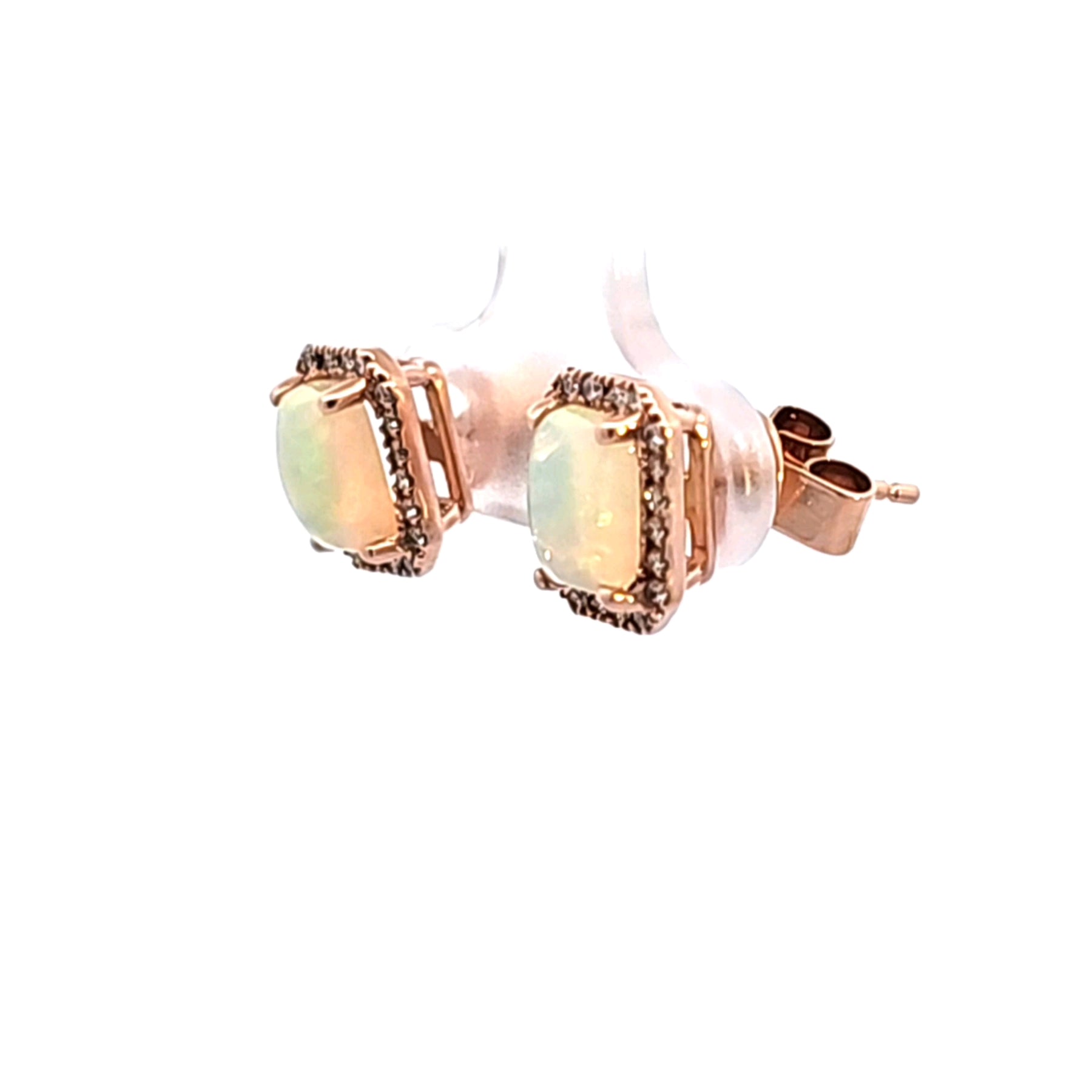 Discover the allure of these stunning 14K rose gold opal earrings, designed to elevate any outfit. The unique 1.40 carat total weight of emerald cut cabochon opal stones shimmer with a captivating play of colors, framed by a delicate halo of .20 carat total weight of sparkling accents. Perfect for both casual and formal occasions, these earrings are a must-have addition to your jewelry collection.