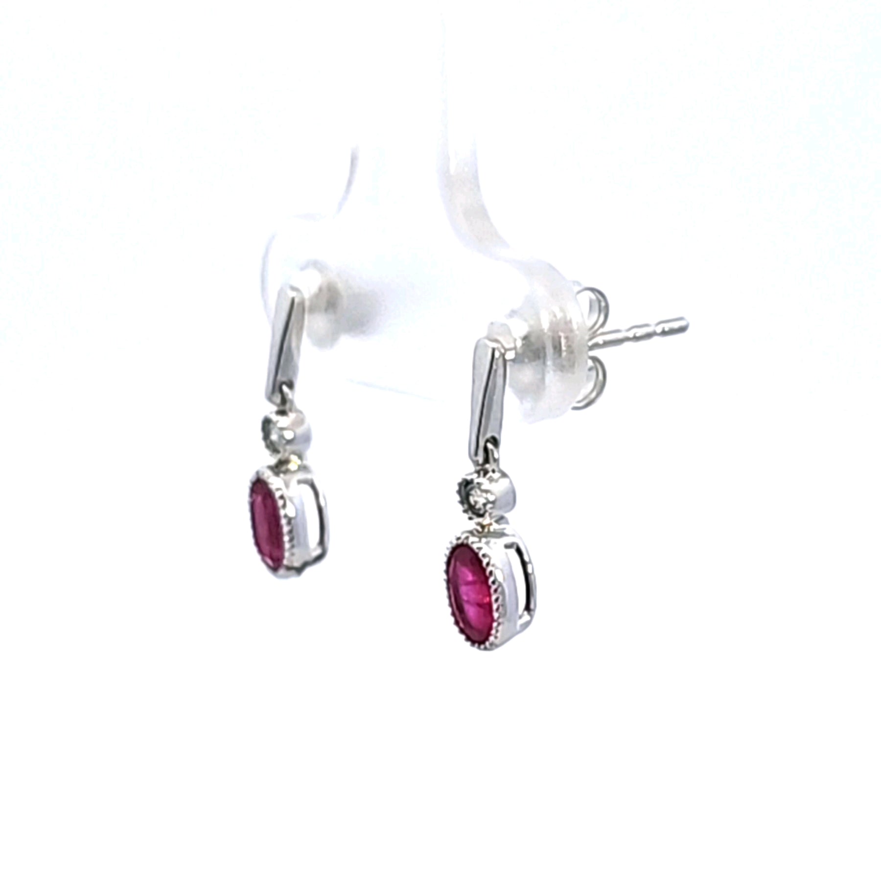 Discover the allure of these elegant 14K white gold oval ruby drop earrings, designed to add a touch of sophistication to any outfit. The .60 carat total weight of vibrant rubies are beautifully complemented by .05 carat total weight of sparkling diamonds, creating a stunning contrast that catches the light with every movement.