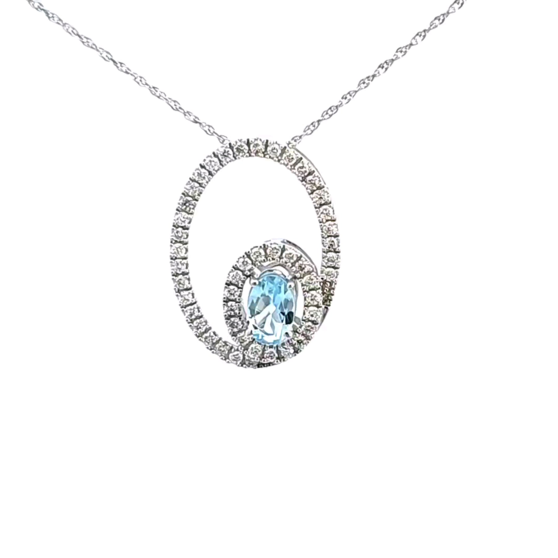 This stunning 14K white gold pendant features a captivating .42 carat oval aquamarine, elegantly surrounded by a halo of sparkling diamonds inside an oval diamond studded frame. Crafted with precision, it adds a touch of sophistication to any outfit, making it perfect for both casual and formal occasions. The total diamond weight is .33 carat, and the pendant is suspended from an eighteen inch light rope chain.