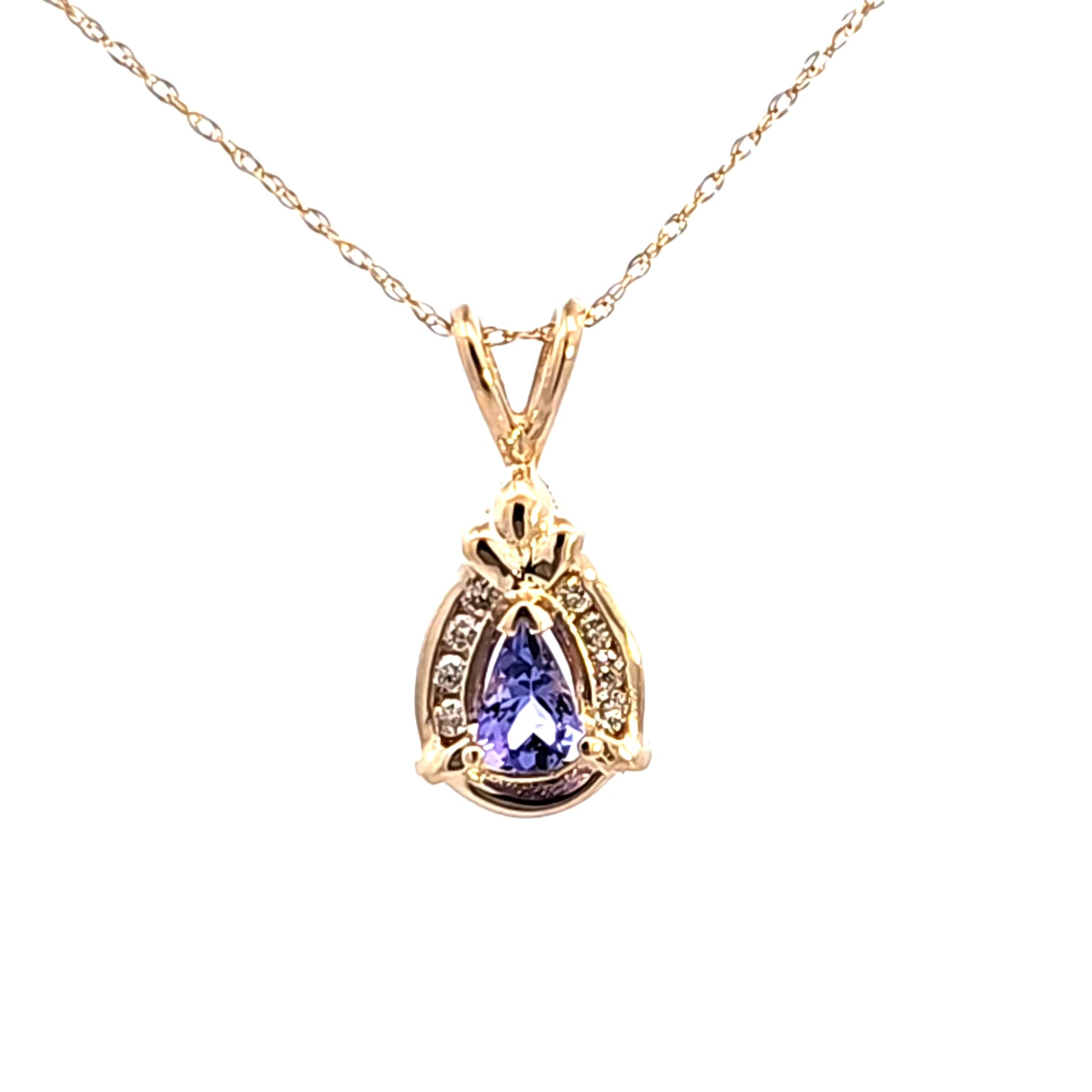 Elevate your elegance with this stunning yellow gold pendant. A six by four mm pear-shaped tanzanite takes center stage, exhibiting a captivating bluish-purple hue. The pendant's design and .12 carat total weight of diamond accents complement the unique gemstone, creating a harmonious and sophisticated accessory. The chain can be purchased separately.