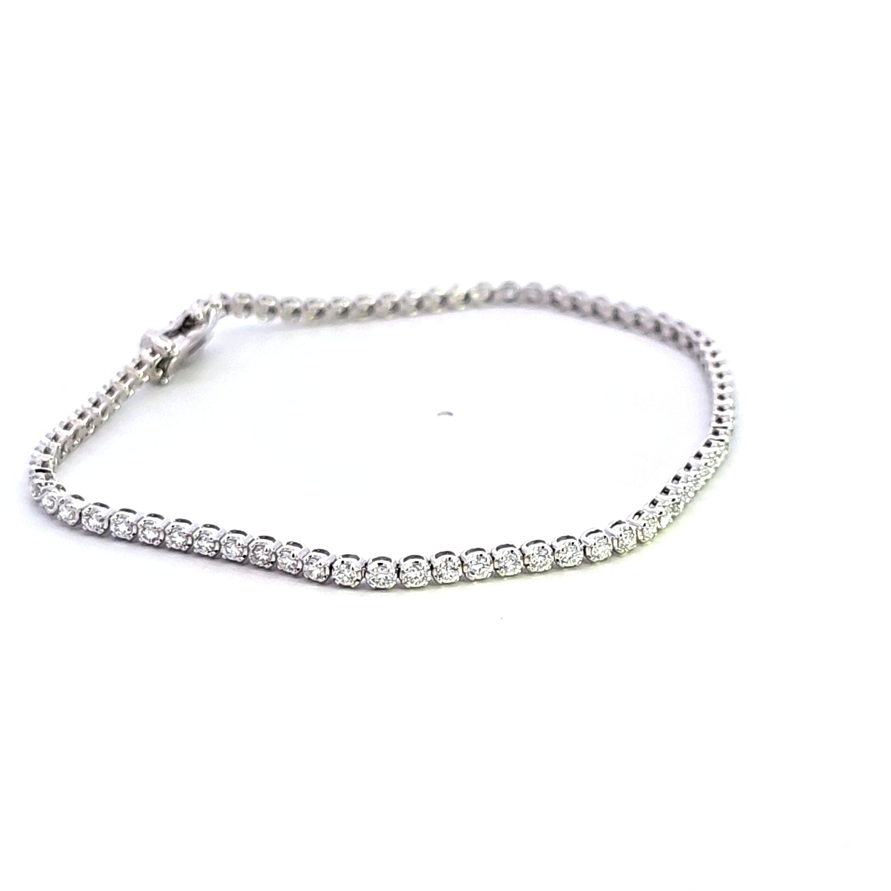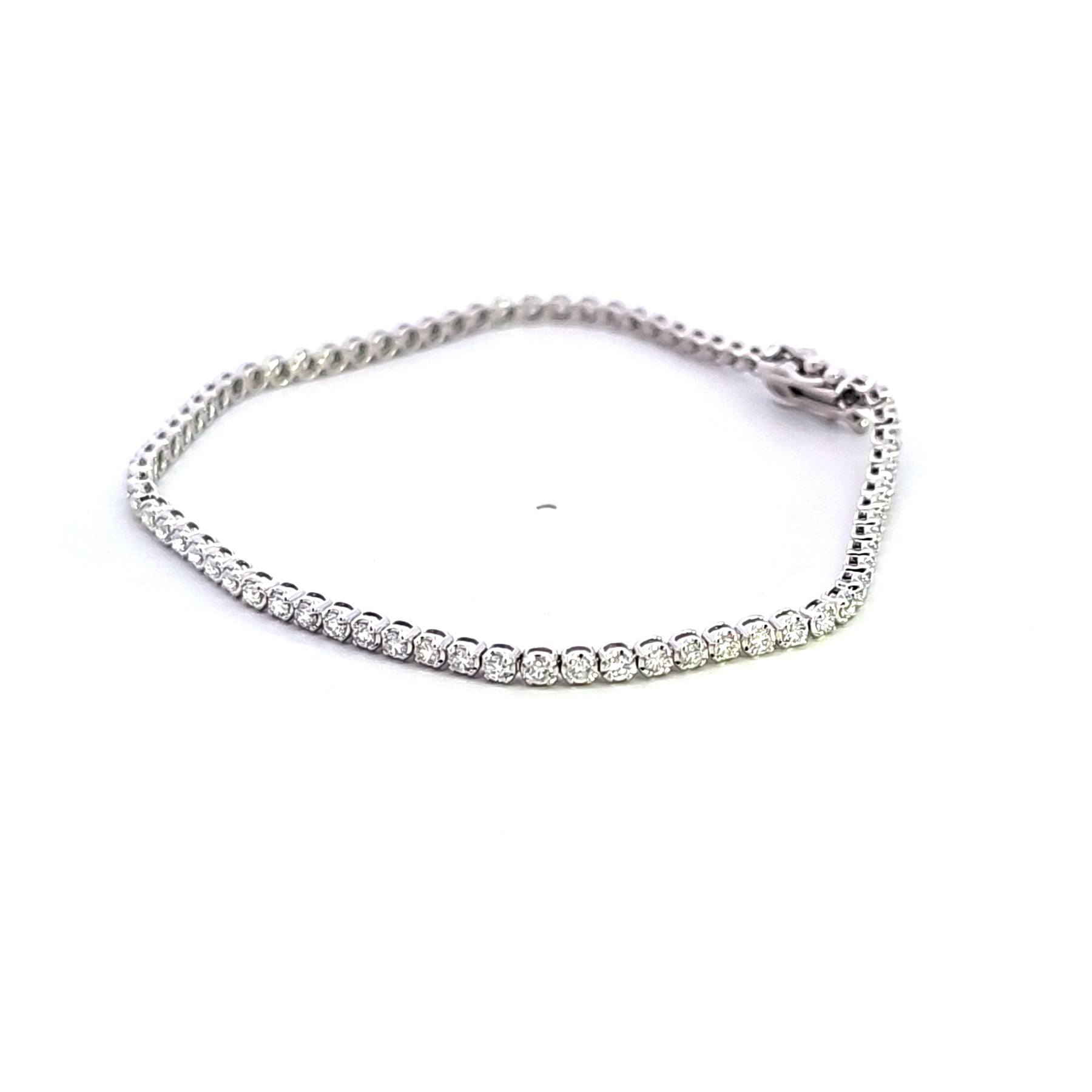 Dazzle with this classic tennis bracelet, crafted in luminous 14K white gold. Showcasing a seamless line of 1.50 carat total weight of SI3 to I1 clarity and H color diamonds, this exquisite bracelet radiates timeless elegance and sophistication. A perfect accessory to add a touch of refined luxury to any ensemble. Experience the allure of captivating sparkle and sleek design.