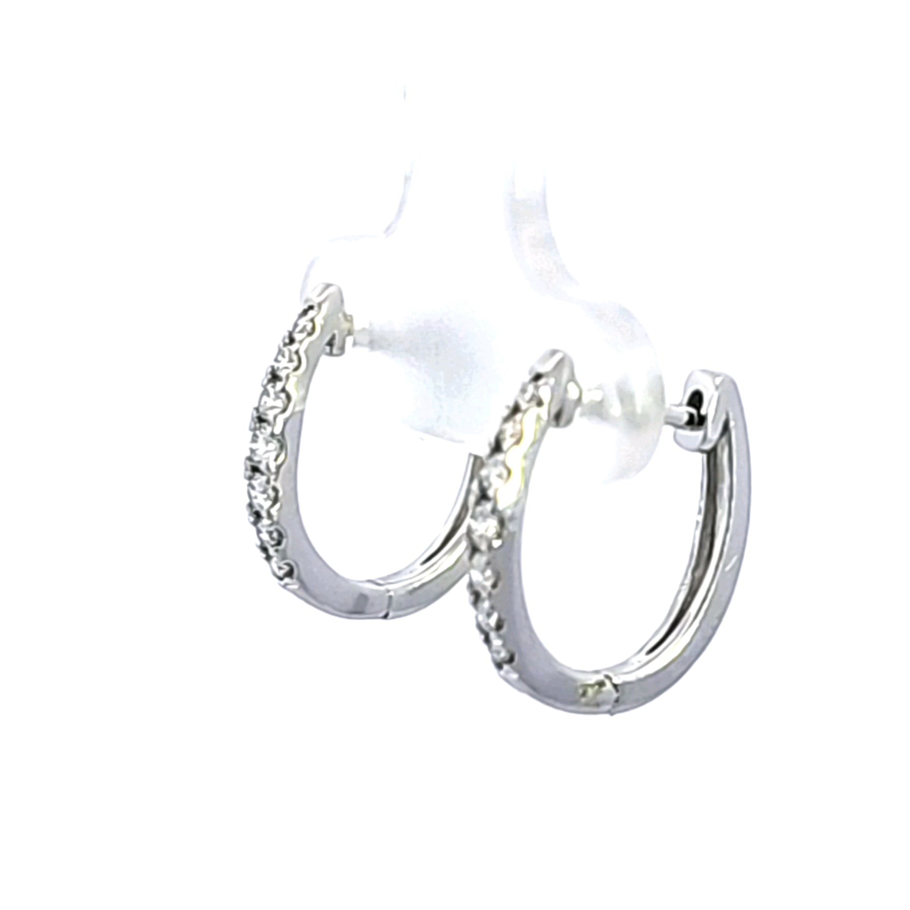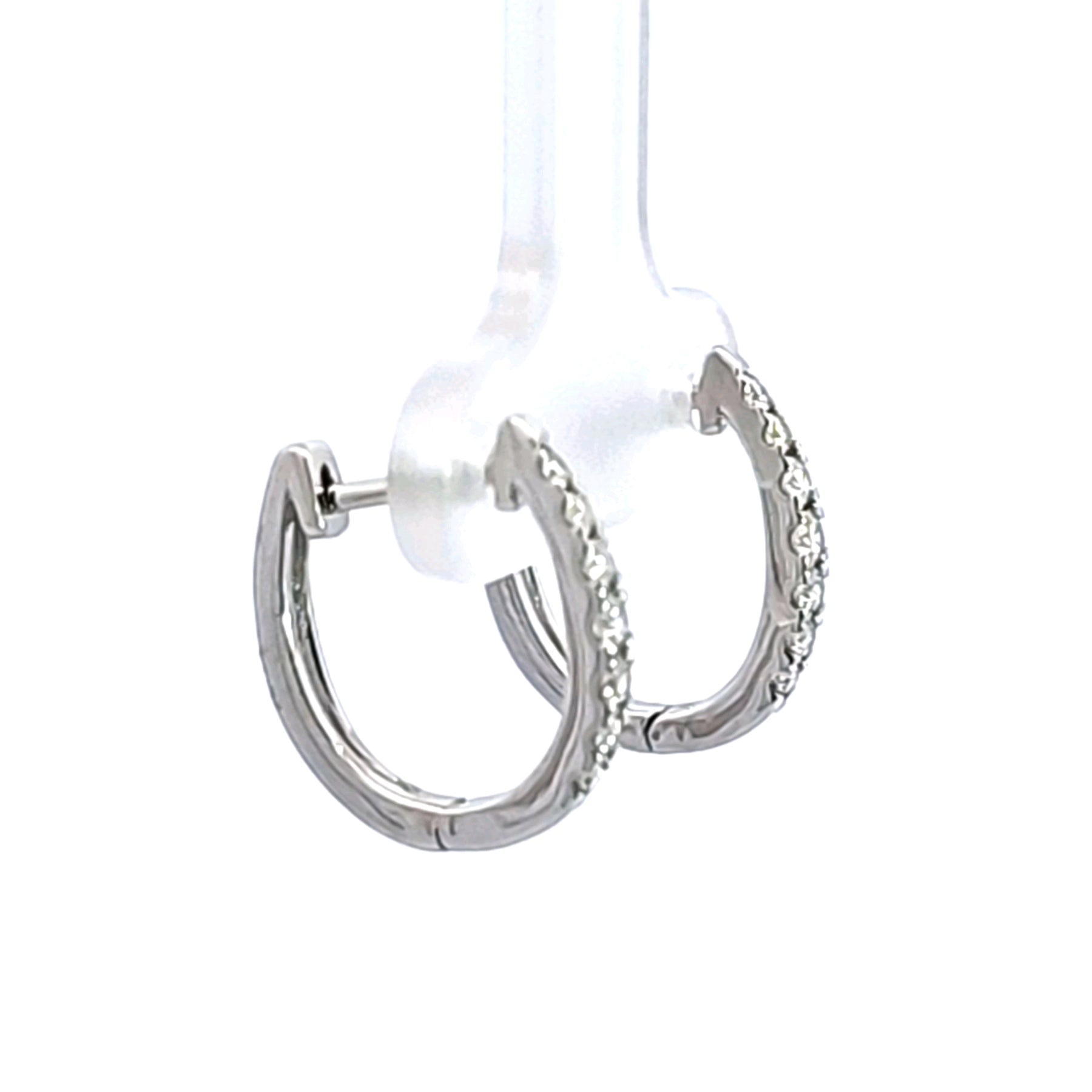 These stunning 14K white gold diamond hoop earrings are the perfect accessory for any occasion. Crafted with precision, they feature a delicate design that adds a touch of elegance to your outfit. Whether you're dressing up for a night out or adding sparkle to your everyday look, these earrings are sure to impress. These earrings feature a total diamond weight of .25 carat.