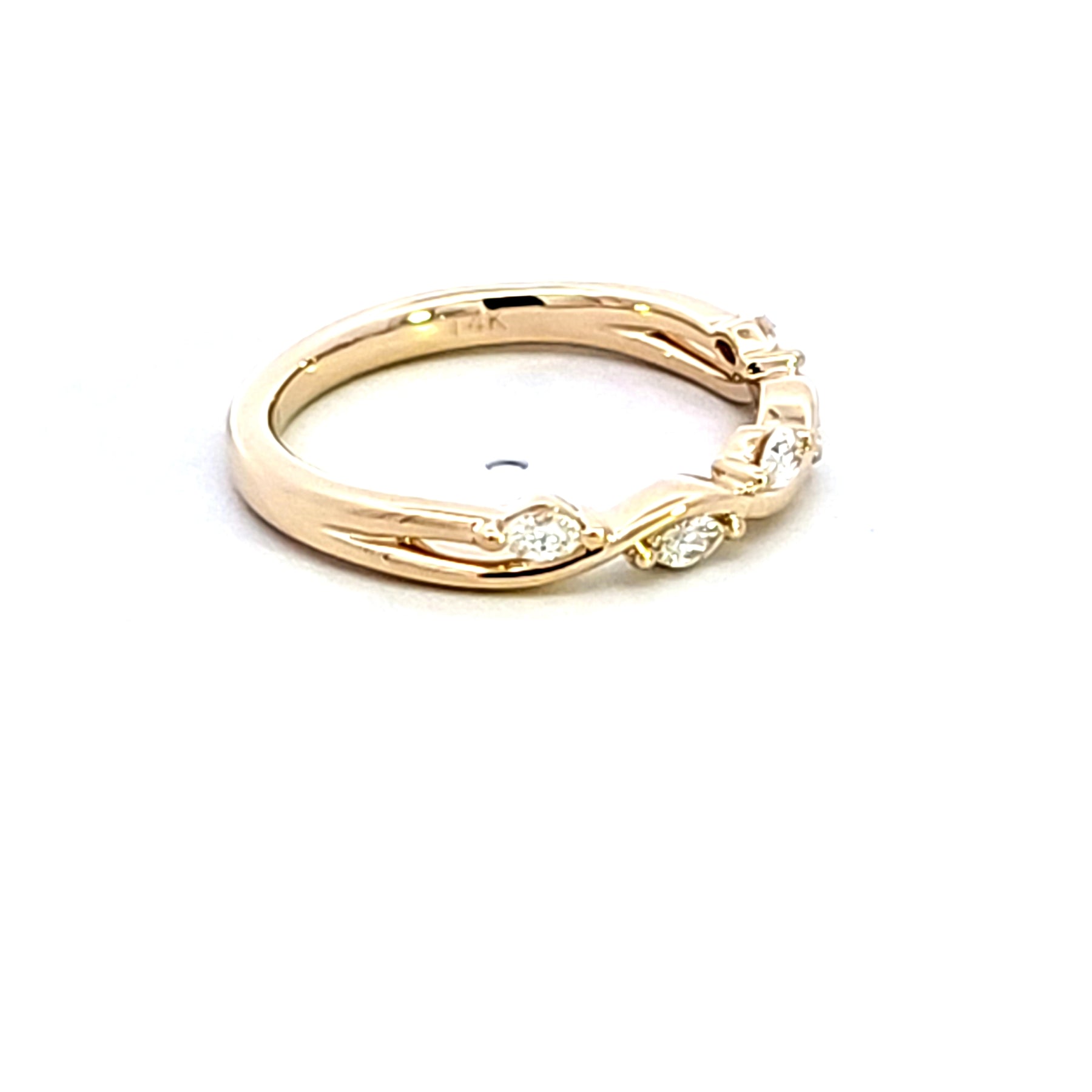 This elegant wedding band ring is crafted from lustrous 14K yellow gold, offering a warm and radiant glow. The ring features a series of .20 carat total weight of marquise-cut diamonds set in a curved style. This band is a timeless piece and can be used alone or as a wedding band.