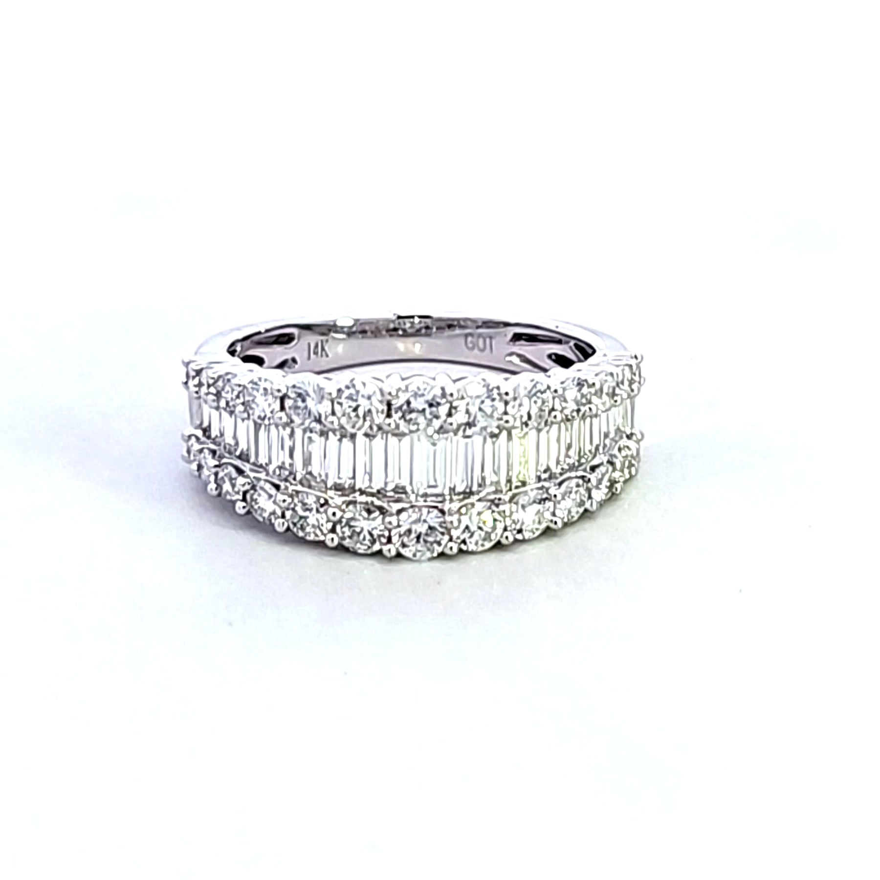 Indulge in the timeless elegance of this 14K white gold anniversary ring, meticulously crafted with 1.50 carat total weight of diamonds. The center row of baguette diamonds is accentuated by row of round diamonds set to each side. This ring embodies enduring style and luxury, perfect for celebrating everlasting moments.
