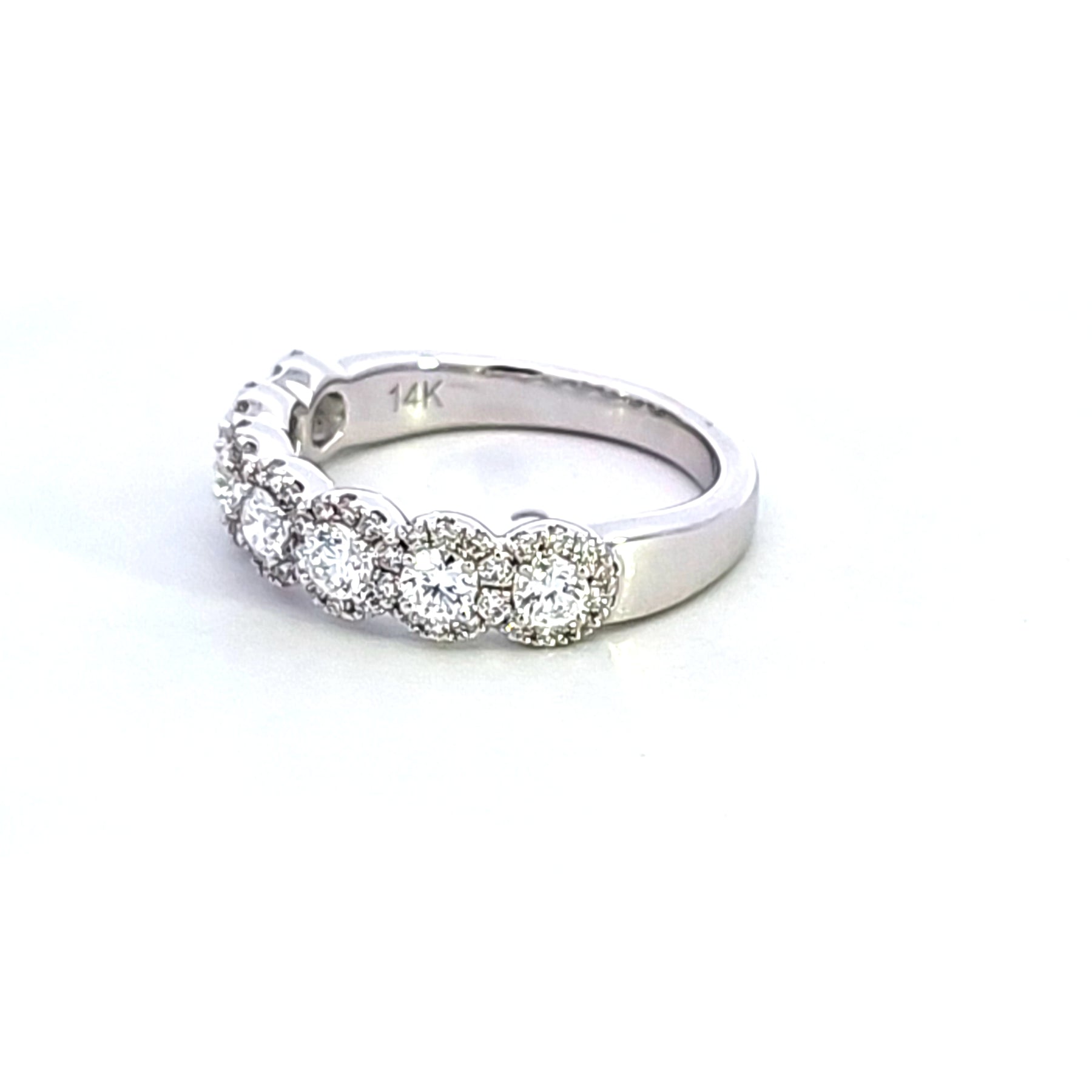 This stunning 14K white gold ring features a row of one carat total weight of brilliant round cut diamonds. The classic design offers timeless elegance, perfect for symbolizing everlasting love or celebrating a special milestone. The diamonds are set to maximize their sparkle and fire, creating a mesmerizing display of light.