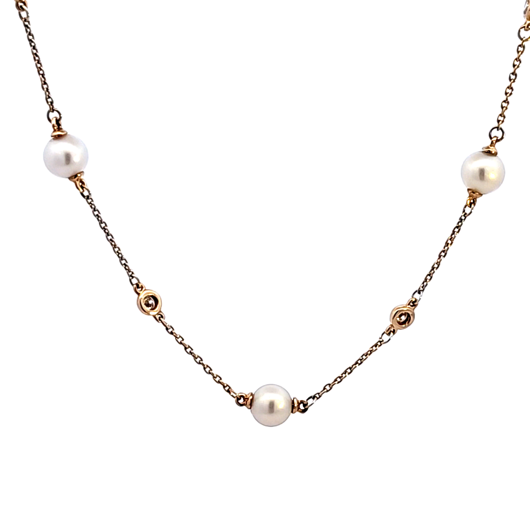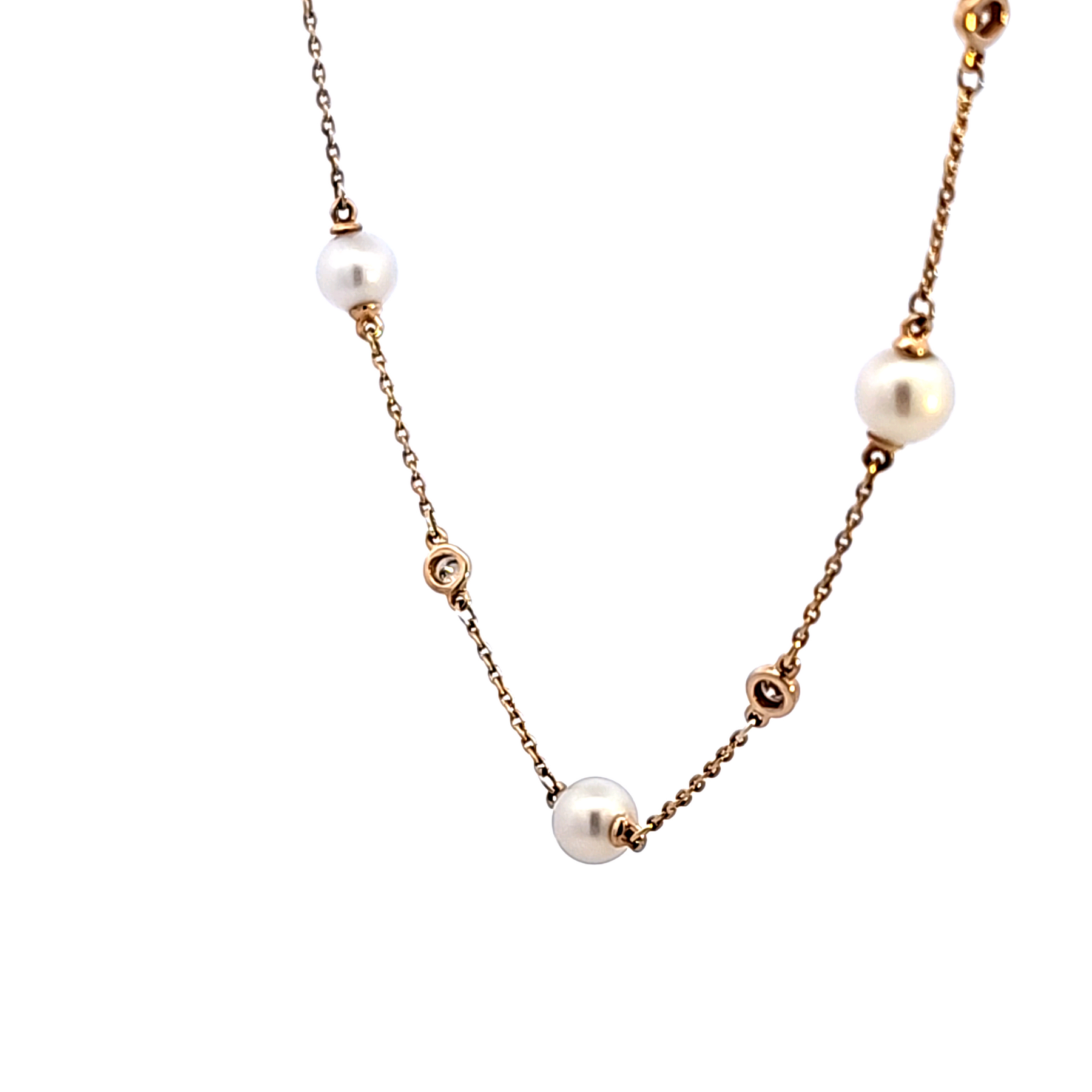 This exquisite necklace features lustrous pearls and bezel set diamonds delicately spaced along a fine gold chain, creating a timeless piece that exudes sophistication and grace. Perfect for both formal occasions and everyday elegance, this necklace is a must-have addition to any jewelry collection.