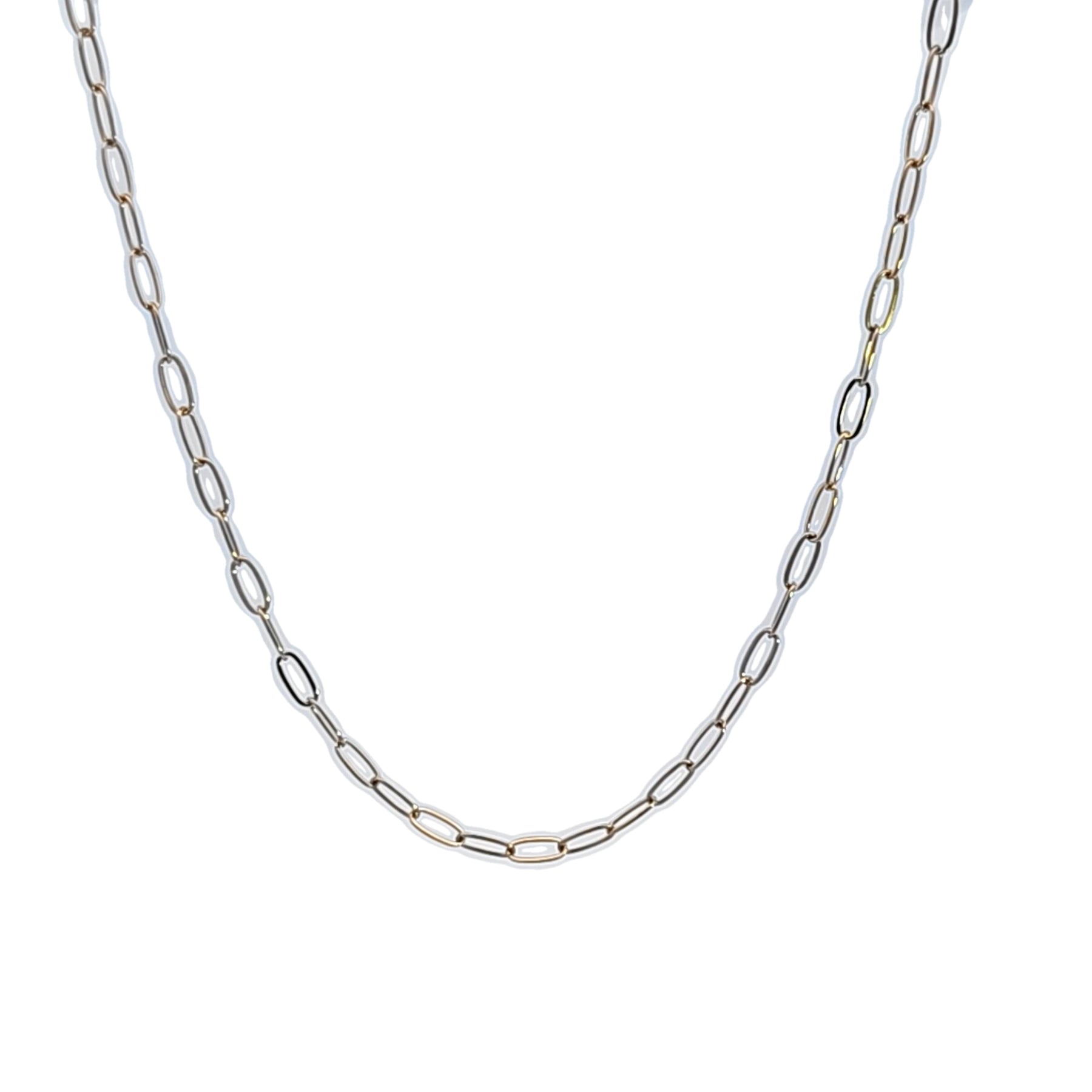 Crafted with precision, this 18K yellow gold plated sterling silver Paper Clip chain necklace offers timeless elegance. The simple yet refined link pattern exudes class and grace, making it a versatile piece that complements various styles effortlessly. The chain is 18 inches and is available in various lengths.