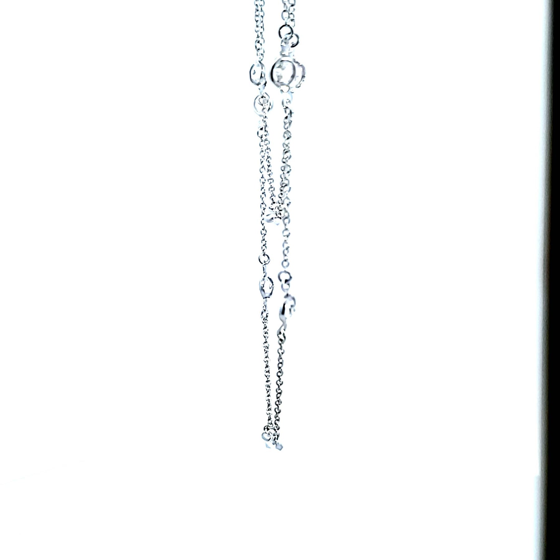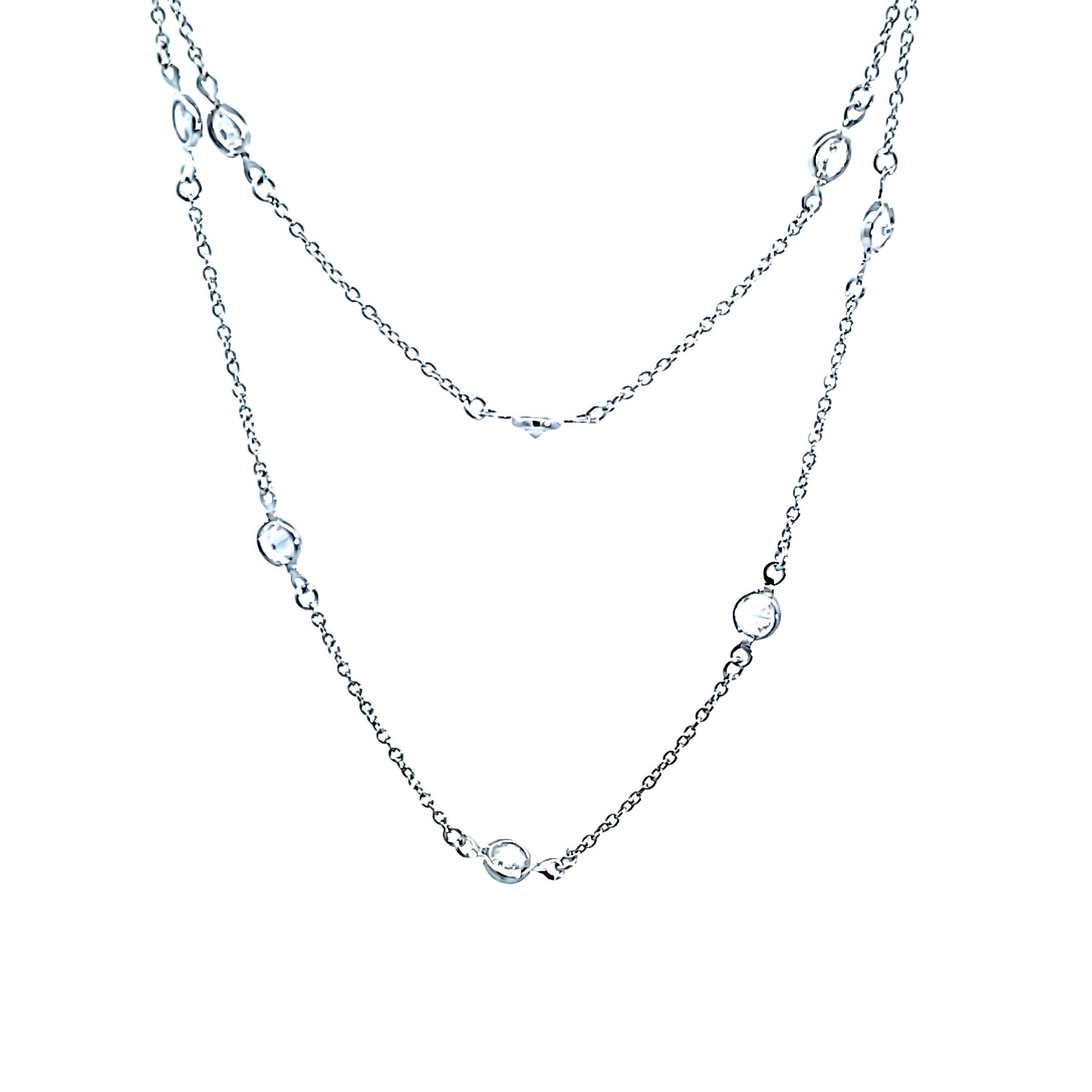 Add a subtle sparkle to your look with this exquisite 36 inch bezel station necklace. The fine chain is interspersed with shimmering cubic zirconias, making it an ideal accessory for enhancing both everyday and special occasion outfits. There are twenty three cubic zirconias with a total weight of six carats, crafted in platinum plated sterling silver.