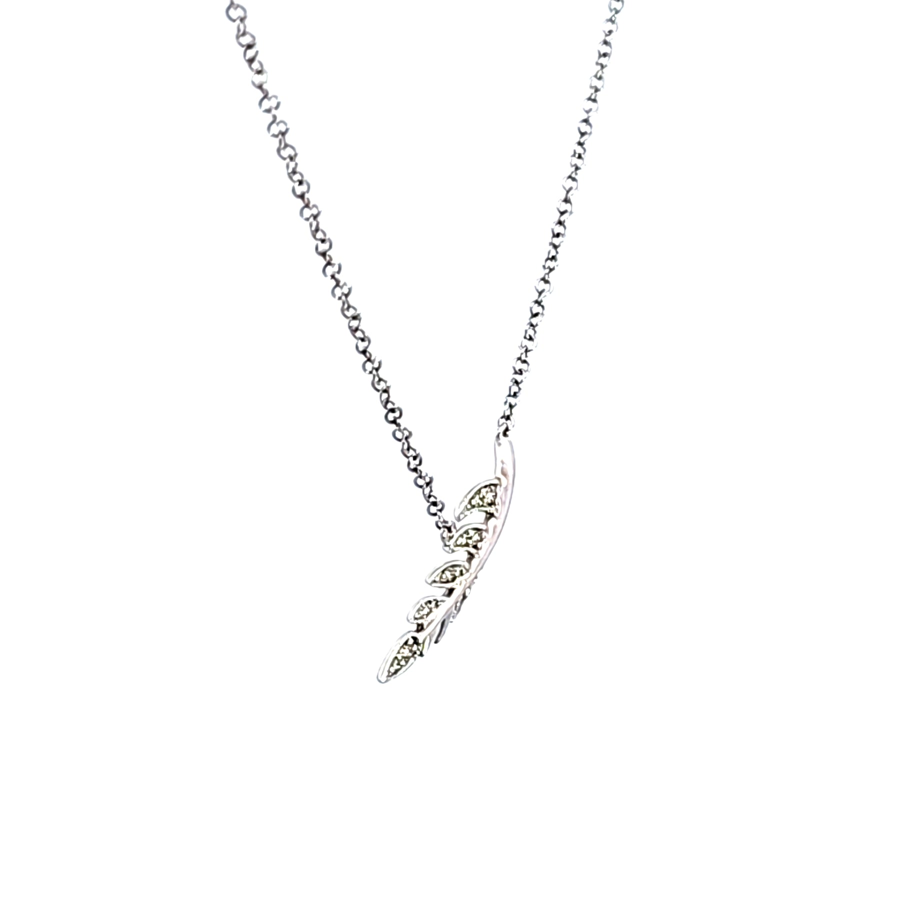 Exquisitely crafted, this 14K white gold pendant necklace features a delicate leaf design. The pendant is adorned with .05 carat total weight of round cut diamonds set in a brilliant style, reflecting light with every movement. The necklace's elegant white gold color complements the sparkle of the diamonds, suspended vertically, creating a timeless piece.