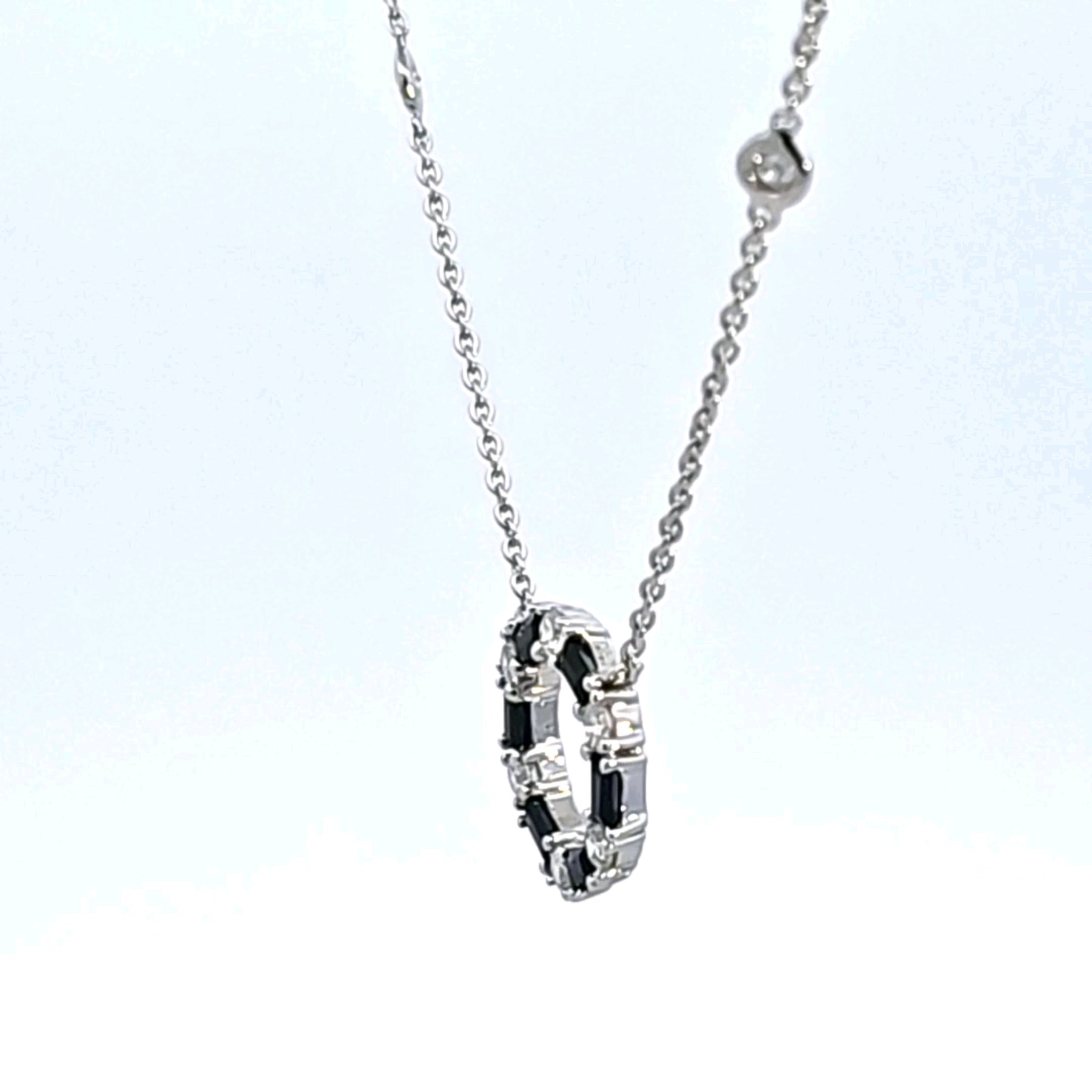 This stunning 14K white gold pendant features a unique circular design adorned with .65 carat total weight of deep blue sapphire baguettes. The intricate detailing and .45 carat total weight of sparkling diamonds create a captivating piece that adds a touch of elegance to any outfit. Perfect for both casual and formal occasions, this pendant is a must-have accessory for jewelry lovers, and features an 18 inch open link chain.