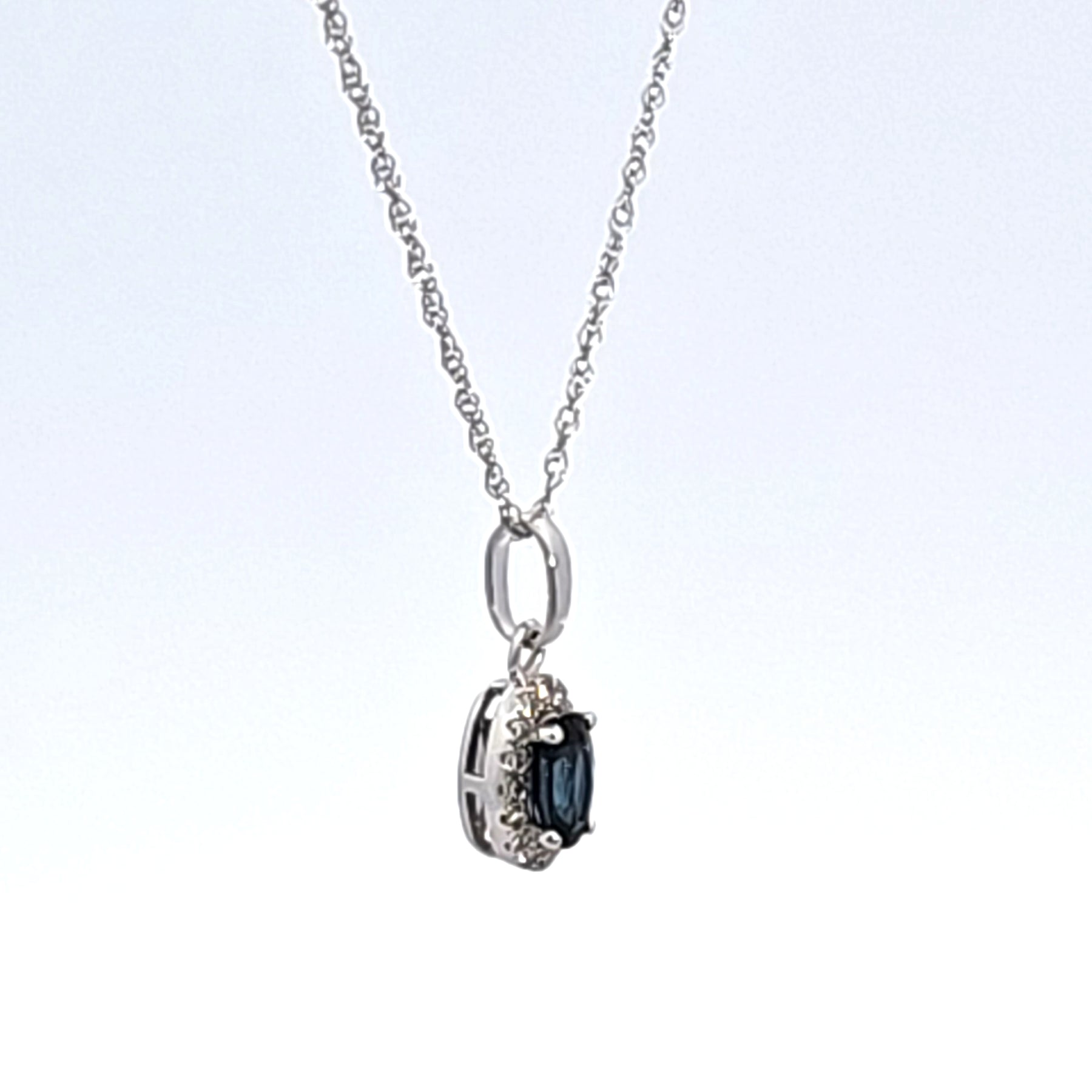 The oval shaped blue sapphire is set within a delicate .07 carat total weight diamond halo setting that enhances its rich color and luster. This elegantly designed necklace offers a timeless appeal, perfect for adding a touch of sophistication to any ensemble. Crafted from 10K white gold, the delicate 18 inch rope chain complements the pendant with subtle elegance.