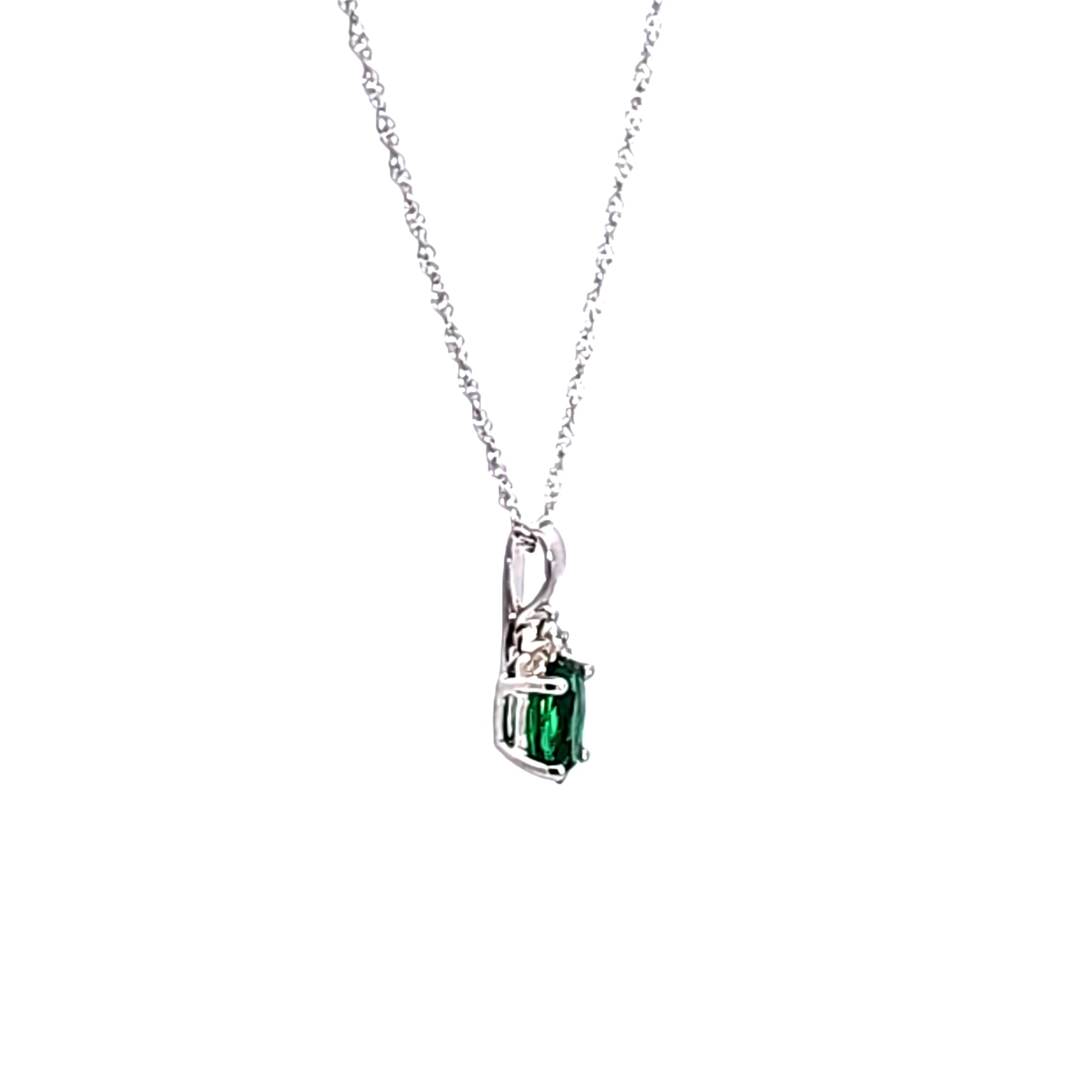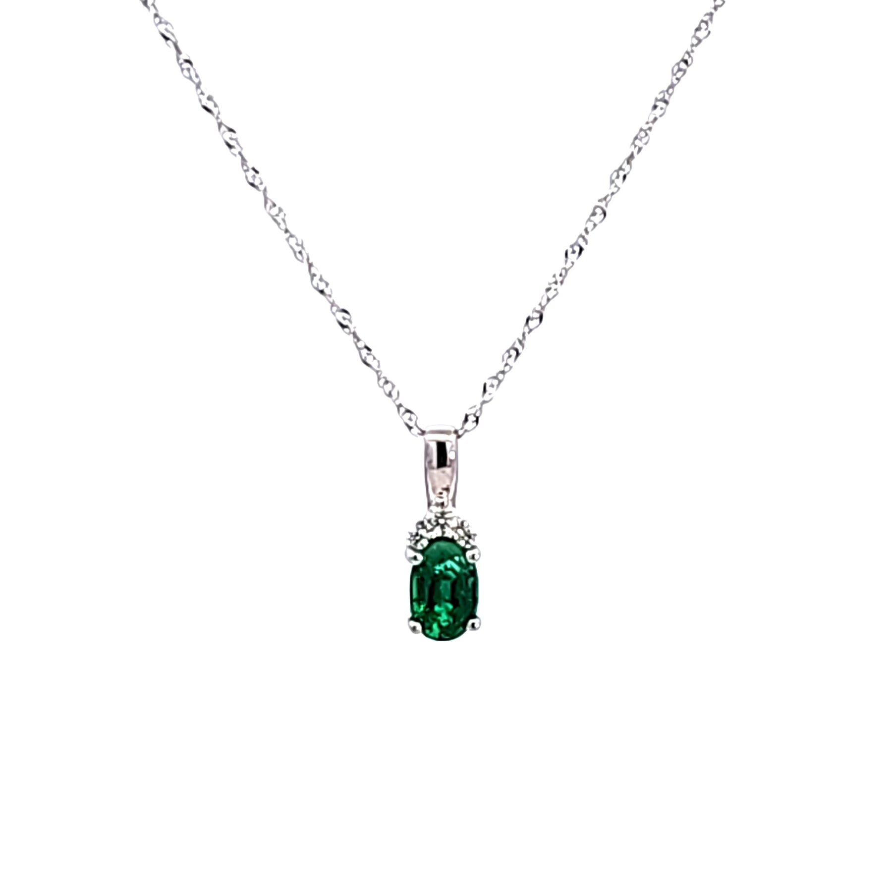 Exquisite pendant featuring an approximately 1/3 carat oval emerald, celebrated for its verdant green hue. The emerald is gracefully set in a 14K white pendant, accented by 1/20 carat total weight of diamonds. A timeless piece that adds a touch of elegance and sophistication to any ensemble. Perfect for daily wear or special occasions. The chain can be purchased separately.