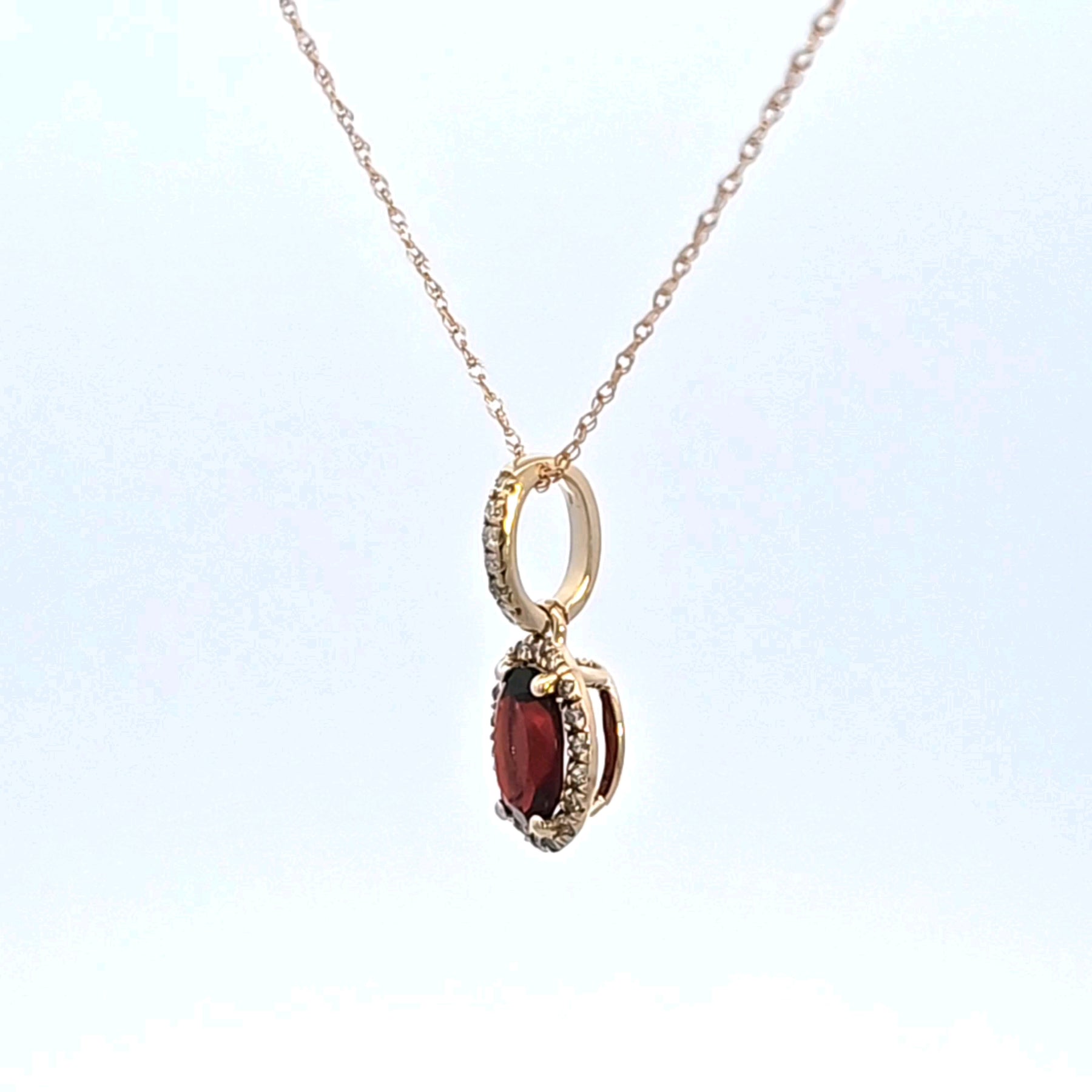 This stunning garnet pendant necklace features a beautifully crafted .90 carat oval gemstone, surrounded by .12 sparkling diamonds. The delicate 18 inch light rope chain adds a touch of elegance, making it perfect for both casual and formal occasions. Wear it to make a statement or gift it to someone special.