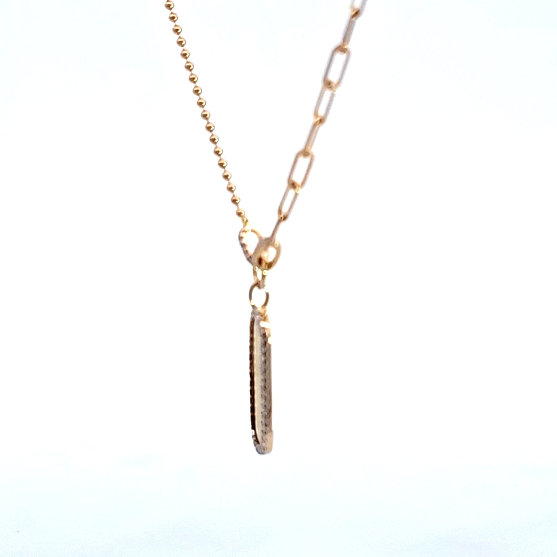 Elevate your style with this captivating 14K yellow gold charm necklace. It features .14 carat total weight of diamonds set around the edge of the charm. This pendant necklace effortlessly combines modern design with timeless elegance. Its understated glamour makes it perfect for everyday wear or special occasions. The pendant is suspended from a unique 18 inch chain which is half beaded and half open link.