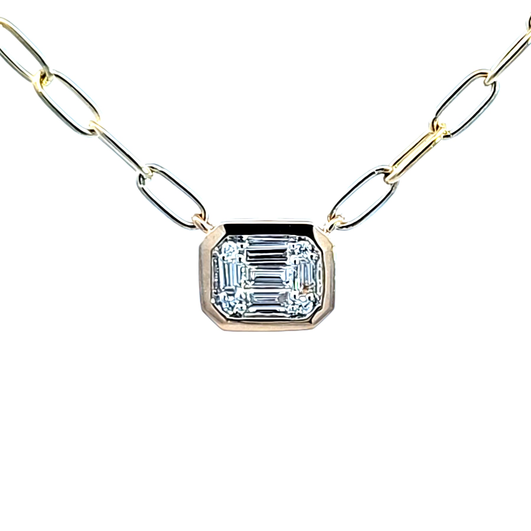 Indulge in the understated elegance of this 14K yellow gold necklace. It features five baguettes and four round diamonds which form the simulated emerald cut center. This diamond necklace exudes sophistication and refined style, perfect for adding a touch of luxury to any ensemble, and is suspended from an 18 inch open link paperclip style chain.
