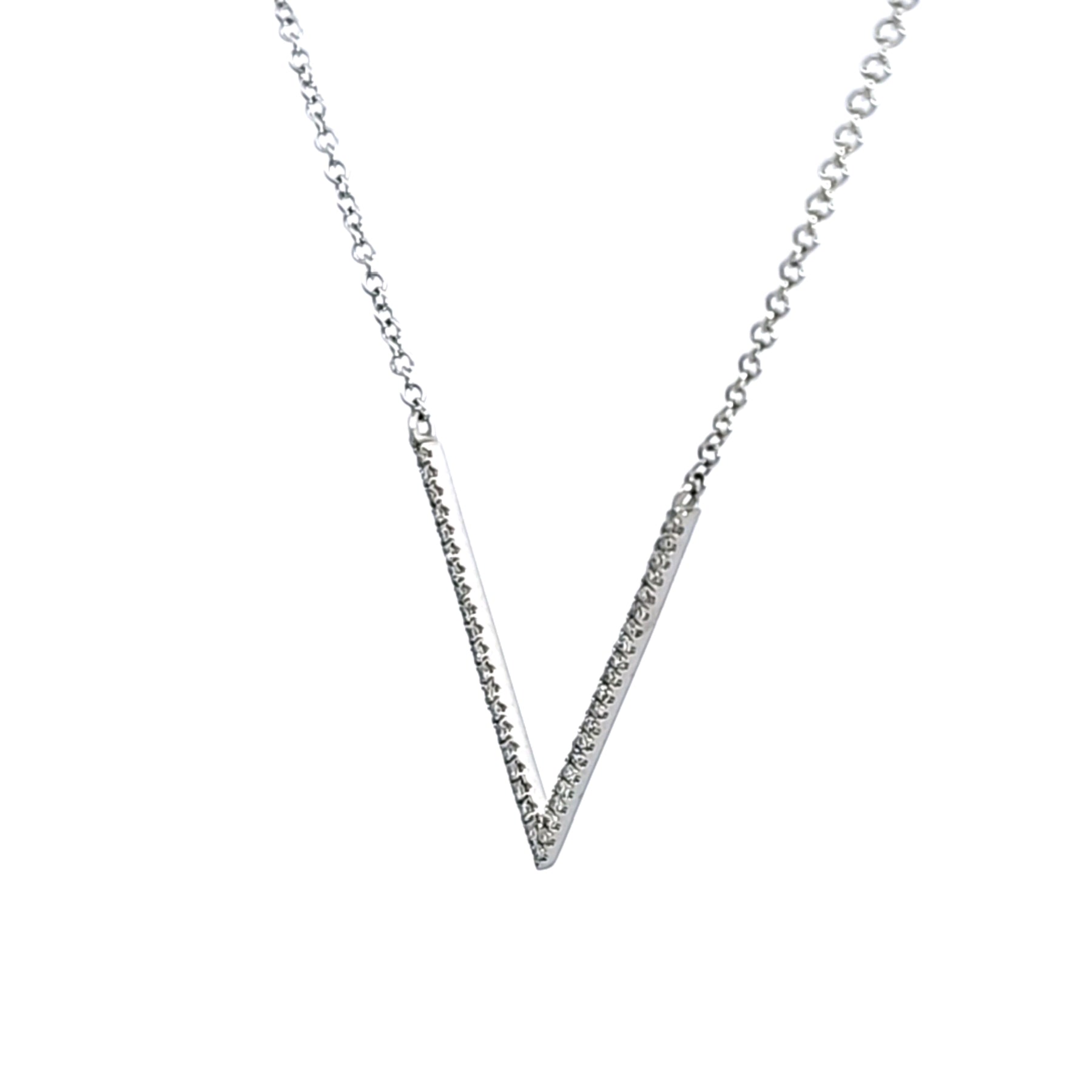 This stunning 14K white gold V-shaped pendant necklace is the perfect accessory to elevate any outfit. Crafted with precision, it features a delicate chain attached to a V-shaped pendant adorned with .12 carat total weight of sparkling diamond accents that catch the light beautifully. Ideal for both casual and formal occasions, this piece adds a touch of elegance and sophistication to your jewelry collection.