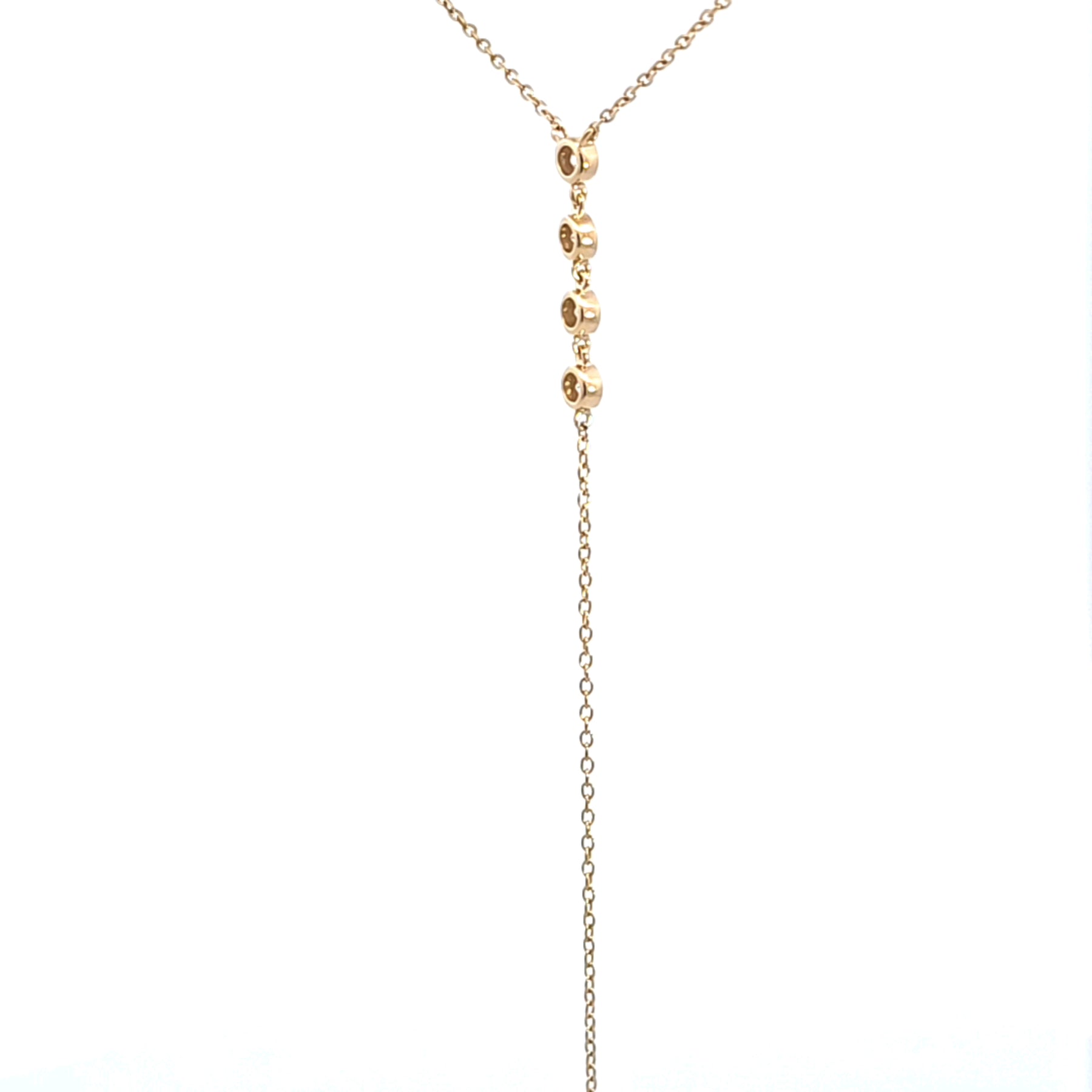 This stunning gold pendant necklace features a delicate chain adorned with .26 carat total weight of sparkling gemstones. The unique design showcases a series of shimmering stones that catch the light beautifully, with a four-inch chain dangle, making it a perfect accessory for any occasion. Elevate your style with this exquisite piece that adds a touch of elegance to your outfit.