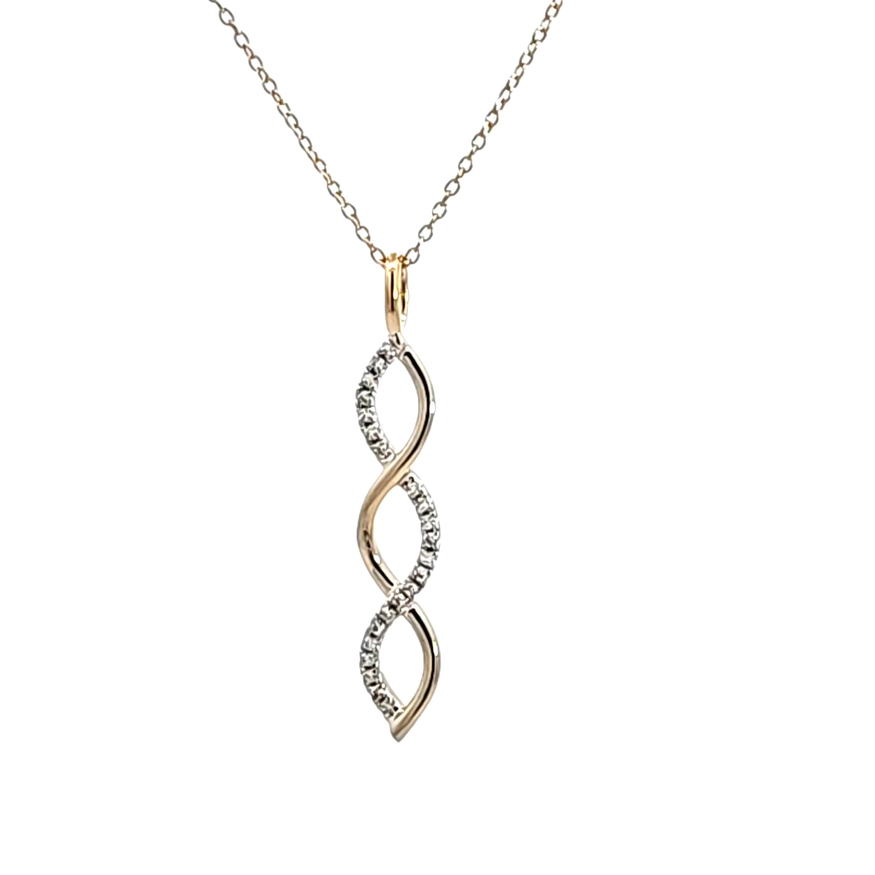 Elevate your style with this mesmerizing 10K yellow gold diamond necklace. Featuring a graceful, swirling pendant adorned with .08 carat total weight of round brilliant cut diamonds, this piece exudes sophistication. A timeless treasure that adds a touch of sparkle to any occasion, it is suspended from an 18 inch open link chain.