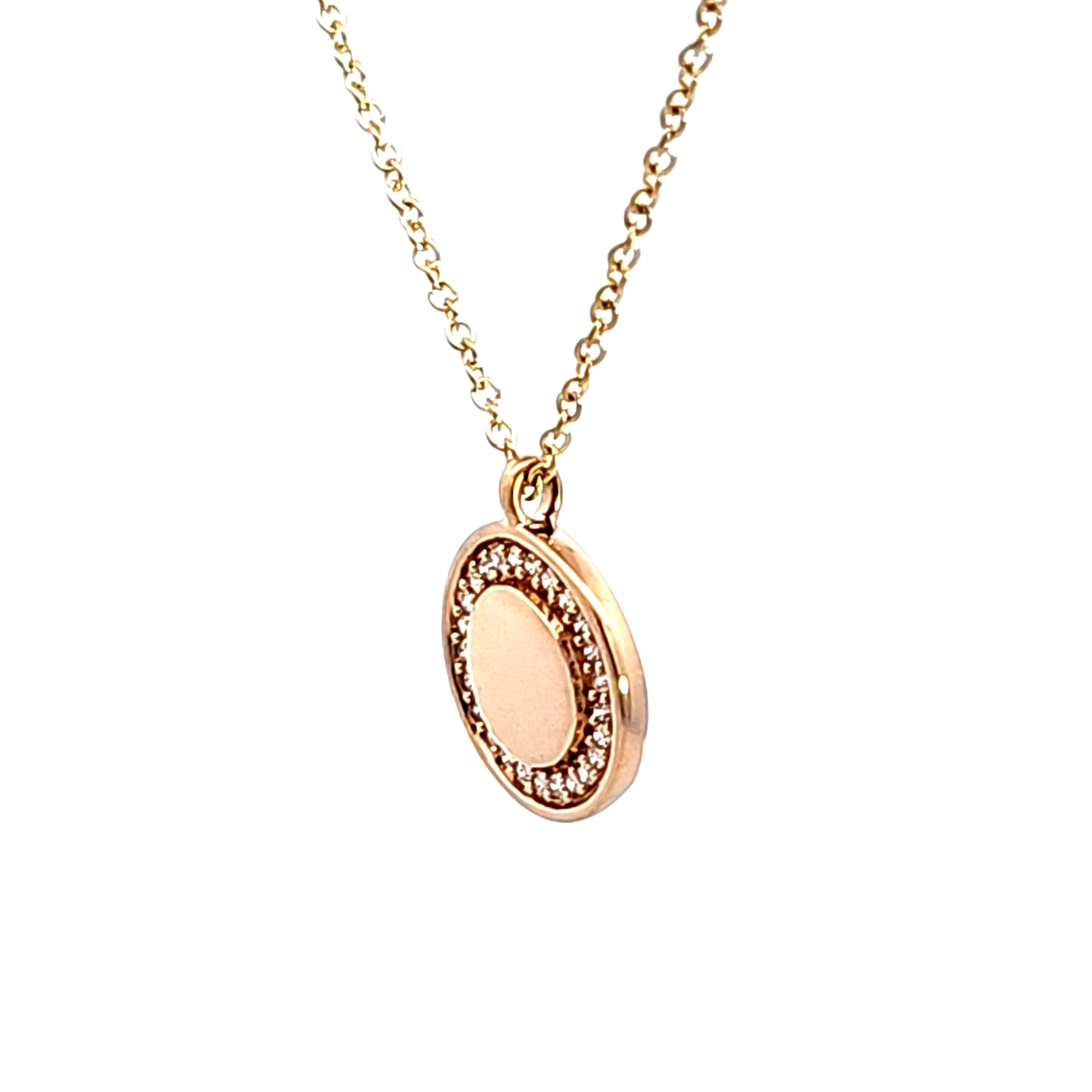 Elevate your style with this exquisite 14K yellow gold charm necklace. The delicate 18 inch light rope chain suspends a captivating round disc with .05 carat total weight of diamonds around, radiating timeless elegance. A perfect accessory for adding a touch of sophistication to any ensemble.