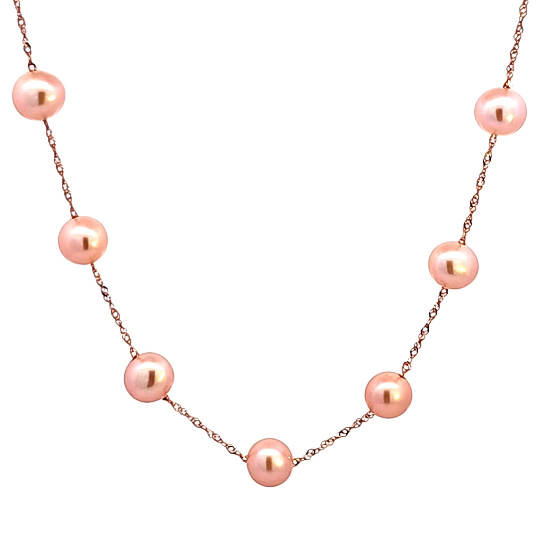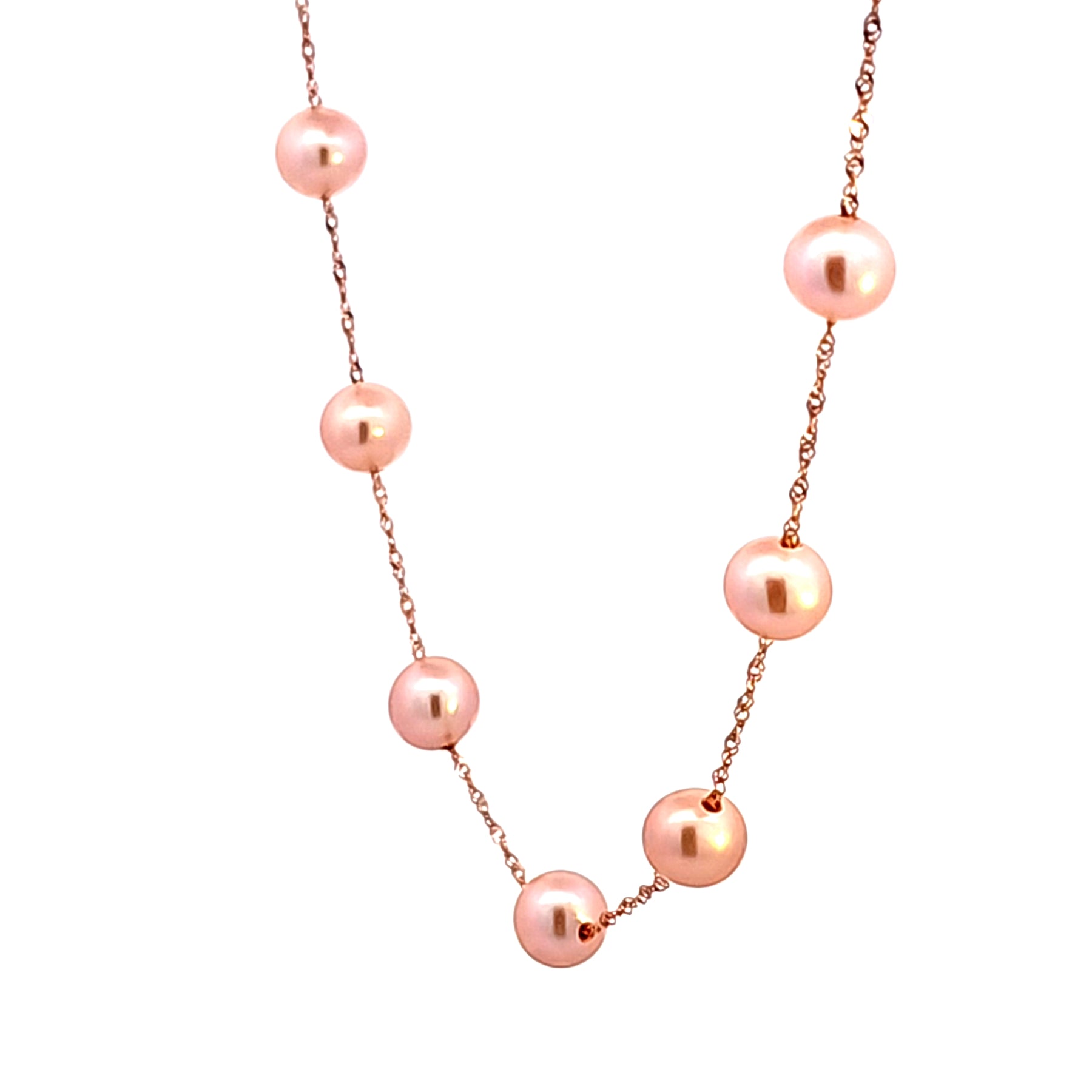 Elevate your elegance with this exquisite pearl necklace, featuring lustrous freshwater potato pearls in a delicate pink hue. The pearls are spaced out on an 18 inch 14K rose gold chain. This necklace adds a touch of sophistication to any ensemble.