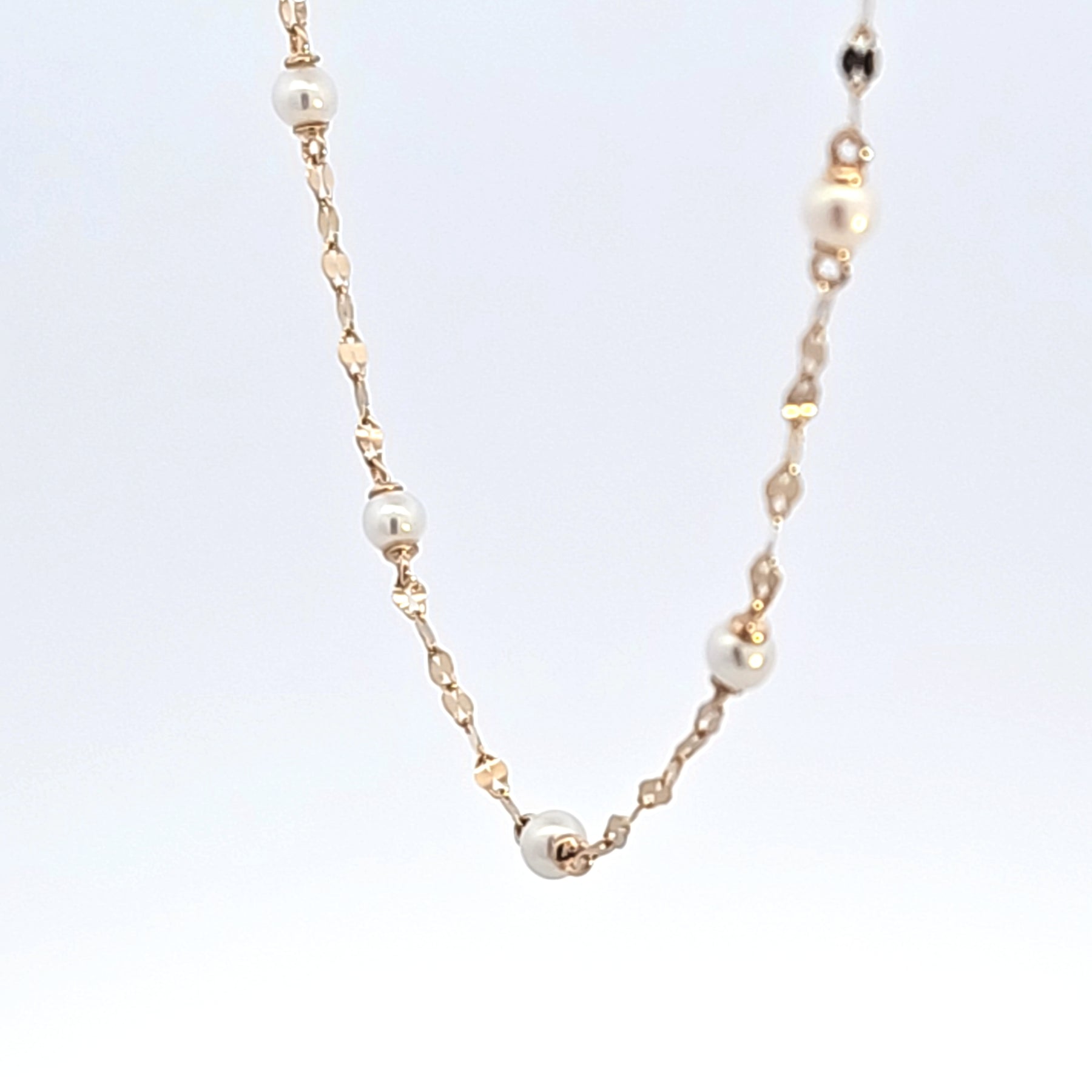 Elevate your style with this elegant pearl necklace, featuring lustrous, round cultured pearls gracefully interspersed along a delicate eighteen inch 14K yellow gold sparkle chain. The necklace offers a timeless design that adds a touch of sophistication to any ensemble. Perfect for both everyday wear and special occasions.