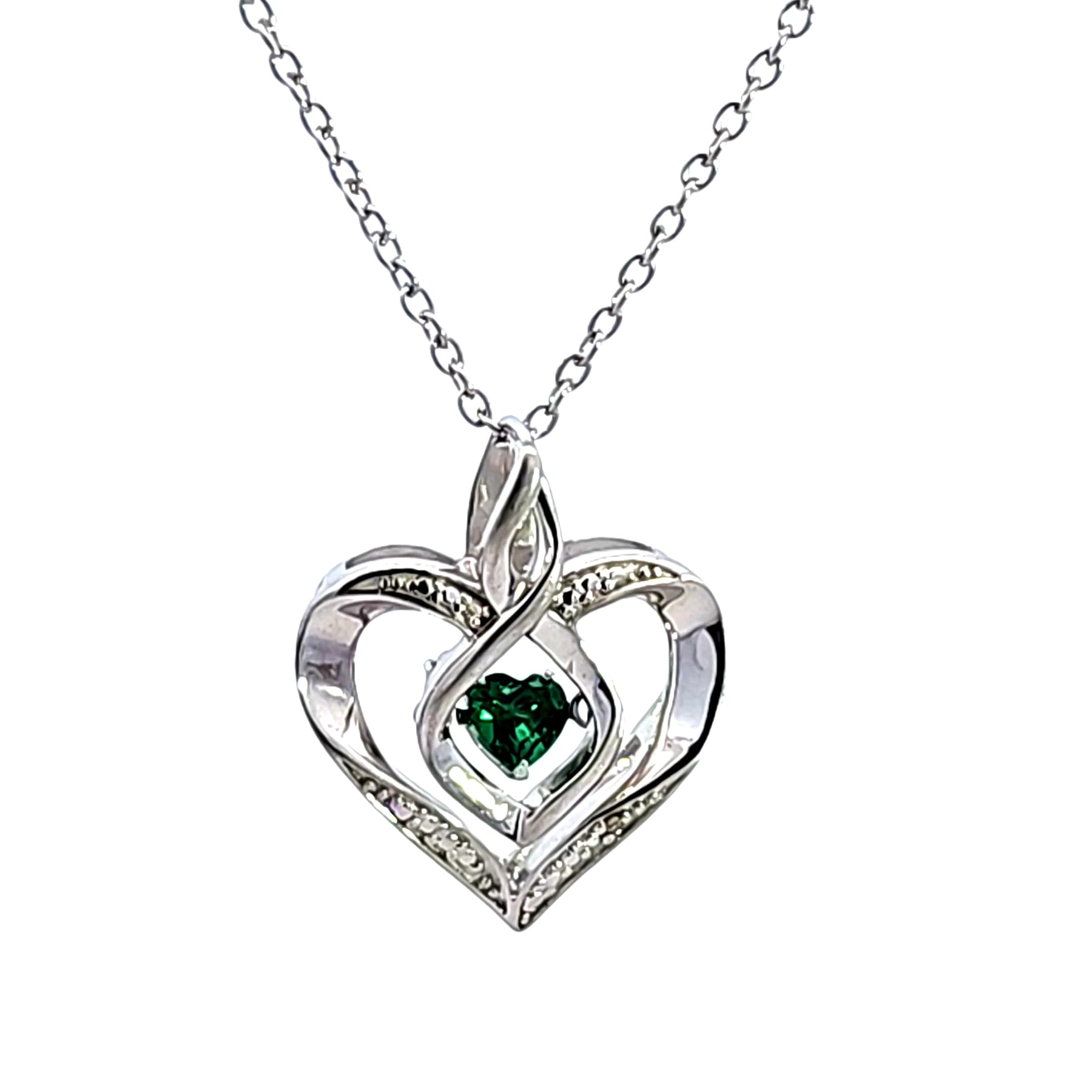 Adorn your neckline with this charming silver pendant. Featuring a heart shaped created emerald, this piece exudes subtle elegance and heartfelt sentiment. The emerald is accented by .02 carat total weight of diamonds and the pendant hangs from an 18 inch open link chain.A perfect symbol of love and style.